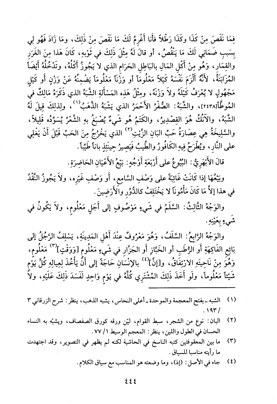 قالَ الأَبْهرِيُّ: البُيُوعُ على أَربَعَةِ أَوْجُهٍ: بَيع الأَعيَانِ الحَاضِرَةِ.