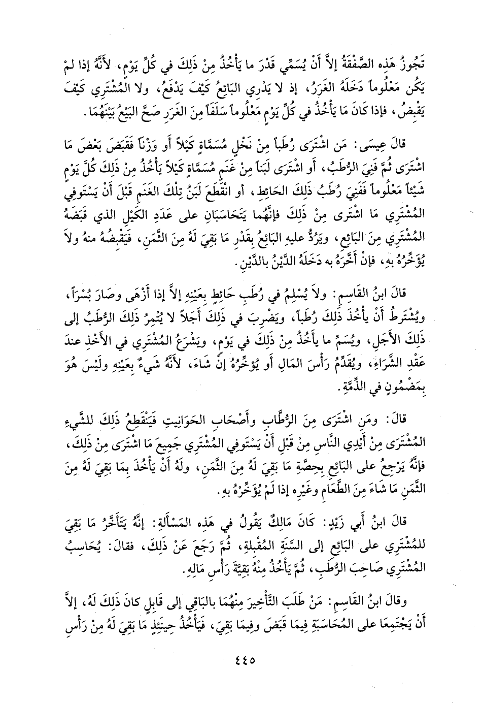 قالَ ابنُ أَبي زَيْدٍ: كَانَ مَالِكٌ يَقُولُ في هذِه المَسْأَلةِ: إنَّهُ يَتَأَخَّرُ مَا بَقِيَ للمُشْتَرِي على البَائِع إلى السَّنَةِ المُقْبِلةِ، ثُمَّ رَجَعَ عَنْ ذَلِكَ، فقالَ: يُحَاسِبُ المُشْتَرِي صَاحِبَ الرُّطَبِ، ثُمَ يَأْخُذُ مِنْهُ بَقِيَّةَ رَأسِ مَالِهِ.