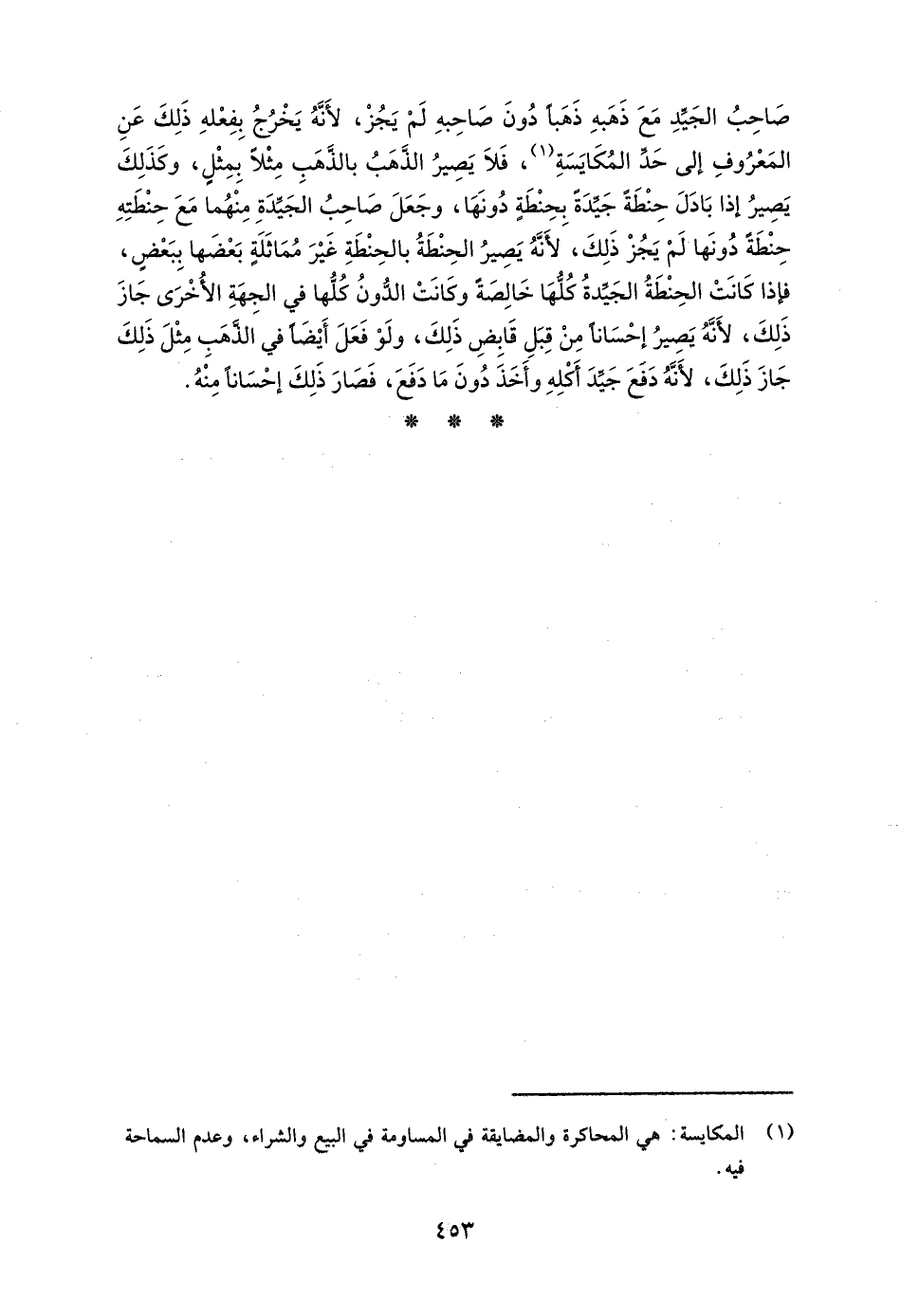 صَاحِبُ الجَيِّدِ مَعَ ذَهبهِ ذَهباً دُونَ صَاحِبهِ لَمْ يَجُزْ، لأَنَّهُ يَخْرُجُ بِفعلهِ ذَلِكَ عَنِ المَعرُوفِ إلى حَدِّ المُكَايَسَةِ (¬1)، فَلَا يَصِيرُ الذَّهبُ بالذَّهبِ مِثْلًا بِمِثْلٍ، وكَذَلِكَ يَصِيرُ إذا بَادَلَ حِنْطَةً جَيّدَة بحِنْطَة دُونَها، وجَعَلَ صَاحِبُ الجَيِّدَةِ مِنْهُما مَعَ حِنْطَتِهِ حِنْطَة دُونَها لَمْ يَجُزْ ذَلِكَ، لأَنَّهُ يَصِيرُ الحِنْطَةُ بالحِنْطَةِ غَيْرَ مُمَاثَلةٍ بعضَها بِبَعض، فإذا كَانَتْ الحِنْطَةُ الجَيّدةُ كُلُّها خَالِصَة وكَانَتْ الدُّونُ كُلّبها في الجِهةِ الأُخْرَى جَازَ ذَلِكَ، لأَنَّهُ يَصِيرُ إحسَانا مِنْ قِبَلِ قَابِضِ ذَلِكَ، ولَوْ فَعَلَ أَيْضا في المذهب مِثْلَ ذَلِكَ جَازَ ذَلِكَ، لأَنَّهُ دَفَعَ جَيِّدَ أَكْلِهِ وأَخَذَ دُونَ مَا دفعَ، فَصَارَ ذَلِكَ إحسَاناً مِنْهُ.
