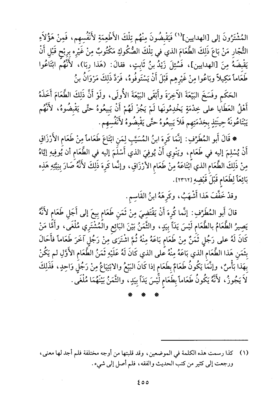 قَالَ أَبو المُطَرِّفِ: إنَّمَا كَرِة ابنُ المُسَيَّبِ لِمَنِ ابْتَاعَ طَعَاماً مِنْ طَعَامِ الأَرزَاق أَنْ يُسْلِمَ إليه في طَعَامٍ، ويَنْوِي أَنْ يُوفيَ الذي أَسْلَمَ إليه في الطَّعَامِ أن يُوفِيهِ إيَّاهُ مِنْ ذَلِكَ الطَّعَامِ الذي ابْتَاعَهُ مِنْ طَعَامِ الأرزَاقِ، وإنَّما كَرِة ذَلِكَ لأَنَّهُ صَارَ بِنيتِهِ هذِه بَائِعَاً لِطَعَامٍ قَبْلَ قَبْضِهِ.