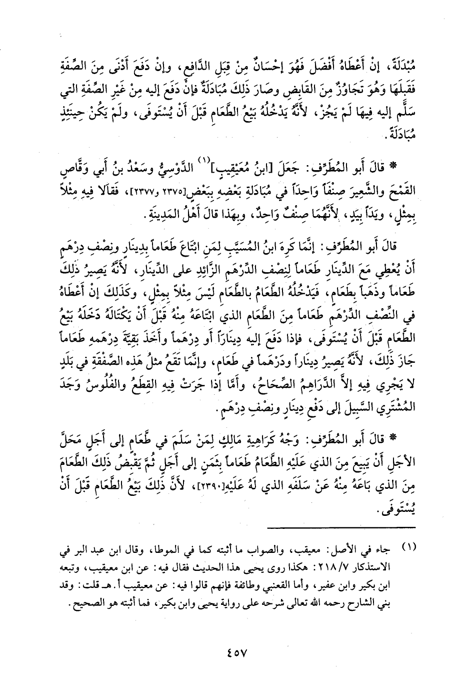 قالَ أبو المُطَرِّفِ: إنَّمَا كَرِهَ ابنُ المُسَيَّبِ لِمَنِ ابْتَاعَ طَعَاماً بِدِينَارٍ ونِصْفِ درْهَمٍ أَنْ يُعطِي مَعَ الدِّينَارِ طَعَاماً لِنِصْفِ الدّرهمِ الزَّائِدِ على الدِّينَارِ، لأَنَّهُ يَصِير ذلِكَ طَعَاماً وذهباً بِطَعَامٍ، فَيدخُلُهُ الطَّعَامُ بالطَّعَامِ لَيْسَ مِثْلاً بِمِثْلٍ، وكَذَلِكَ إنْ أَعطَاهُ في النّضفِ الدِّرهمِ طَعَاما مِنَ الطَّعَامِ الذي ابْتَاعَهُ مِنْهُ قَبْلَ أَنْ يَكْتَالَهُ دَخَلَهُ بَيْعُ الطَّعَامٍ قَبْلَ أَنْ يُسْتَوفَى، فإذا دَفَعَ إليه دِينَارَاً أَو دِرْهَماً وأَخَذَ بقِيَّةَ دِرْهَمهِ طَعَاماً جَازَ ذلِكَ، لأَنَّهُ يَصِيرُ دِينَاراً ودَرهما في طَعَامٍ، وإنَّمَا تَقَعُ مثلُ هذِه الصَّفْقَةِ في بَلَدٍ لا يَجْرِي فِيهِ إلَّا الدَّرَاهِمُ الصِّحَاحُ، وأَمَّا إذا جَرَتْ فِيهِ القِطَعُ والفُلُوسُ وَجَدَ المُشْتَرِي السَّبِيلَ إلى دَفْعِ دِينَارٍ ونصْفِ دِرْهَمٍ.