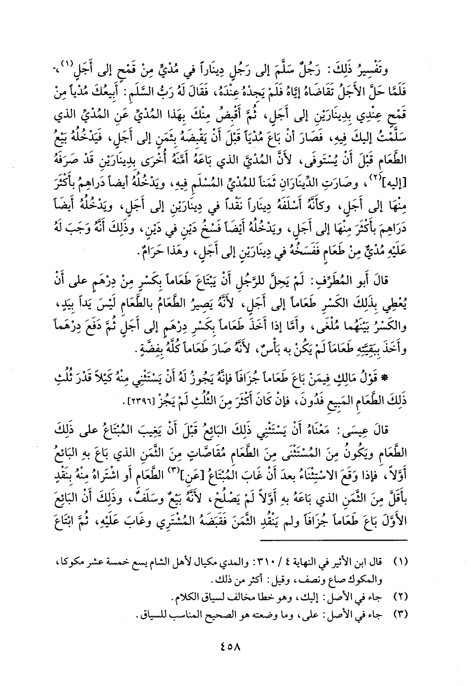 وتَفْسِيرُ ذَلِكَ: رَجُلٌ سَلَّمَ إلى رَجُلٍ دِينَاراً في مُدي مِنْ قَمحٍ إلى أَجَلٍ (¬1)، فَلَمَّا حَلَّ الأَجَلُ تَقَاضَاهُ إيَّاهُ فَلَم يَجِنهُ عِنْدَهُ، فَقَالَ لَهُ رَبُّ السَّلَمِ: أَبِيعُكَ مُدْياً مِنْ قَفحٍ عِنْدِي بِدِينَارَيْنِ إلى أَجَلٍ، ثُمَّ أَقْبِضُ مِنْكَ بِهذا المُدْيِّ عَنِ المُدْيِّ الذي سَلَّمتُ إليكَ فِيهِ، فَصَارَ أنْ بَاعَ مُدياً قَبْلَ أَنْ يَقْبضَهُ بِثَمَنٍ إلى أَجَلٍ، فَيَدخُلُهُ بَيع الطَّعَام قَبْلَ أَنْ يُسْتَوفَى، لأَنَّ المُدْيَّ الذي بَاعَهُ أَمَّنَهُ أُخْرَى بِدِينَارَيْنِ قَدْ صَرَفهُ [إليه] (¬2)، وصَارَتِ الدِّينَارَانِ ثَمَناً للمُديِّ المُسْلَمِ فِيهِ، ويَدخُلُهُ أيضاً دَراهِمُ بأَكْثَرَ مِنْها إلى أَجَلٍ، وكأَنَّهُ أَسْلَفَهُ دِينَاراً نَقْداً في دِينَارينِ إلى أَجَلٍ، ويَدخُلُهُ أَيضَاً دَرَاهِمَ باَكْثَرَ مِنْها إلى أَجَلٍ، ويَدخُلُهُ أَيْضَا فَسْخُ دَيْنٍ في دَيْنٍ، وذَلِكَ أَنَّهُ وَجَبَ لَهُ عَلَيْهِ مُديّ مِنْ طَعَامٍ فَفَسَخُهُ في دِينَارَيْنٍ إلى أَجَلٍ، وهذا حَرَامٌ.