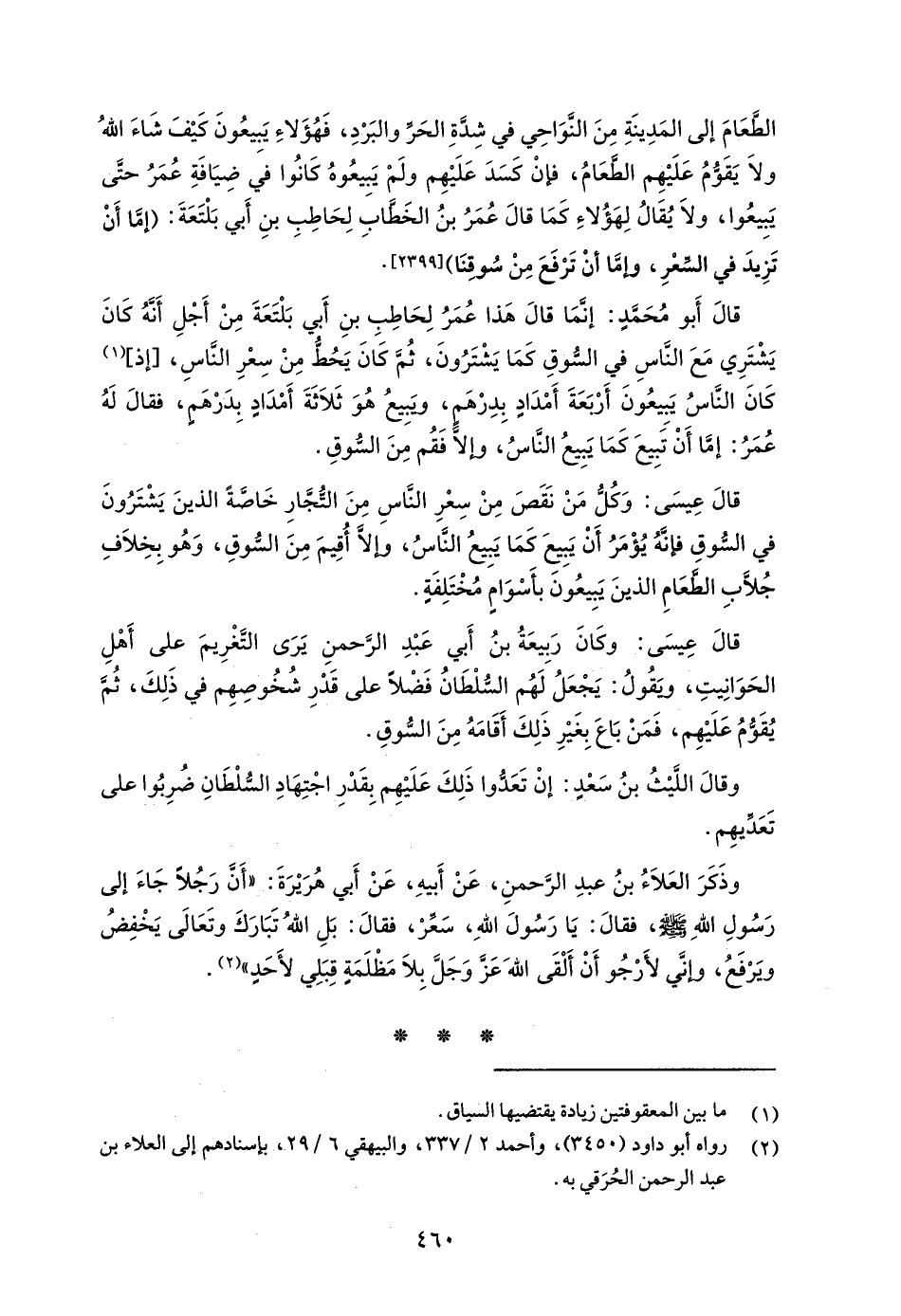 وذَكَرَ العَلاَءُ بنُ عبدِ الرَّحمنِ، عَنْ أَبيهِ، عَنْ أَبي هُرَيْرَةَ: "أَنَ رَجُلًا جَاءَ إلى رَسُولِ اللهِ - صلى الله عليه وسلم -، فقالَ: يا رَسُولَ اللهِ، سَعِّرْ، فقالَ: بَلِ اللهُ تبَارَكَ وتَعَالَى يَخْفِضُ ويَرفَعُ، وإني لأَرجُو أَن أَلْقَى الله -عَزَّ وَجَلَّ- بِلاَ مَظْلَمَة قِبَلِي لأَحَدٍ" (¬2).