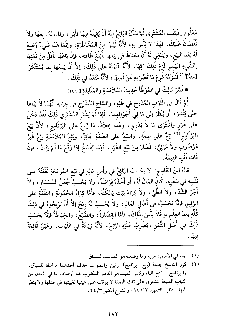 (¬2) كرر الناسخ جملة (بيع البرنامج) مرتين والصواب حذف أحدهما مراعاة للسياق. والبرنامج -بفتح الباء وكسر الميم- هو الدفتر المكتوب فيه أوصاف ما في العدل من الثياب المبيعة لتشترى على تلك الصفة لا يوقف على عينها لغيبتها في عدلها ولا ينظر إليها، ينظر: التمهيد 13/ 14، والشرح الكبير 3/ 24.