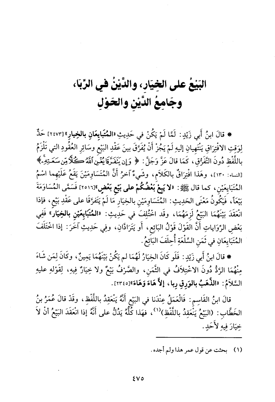 * قالَ ابنُ أَبي زَيْدٍ: لَمَّا لَمْ يَكُنْ في حَدِيثِ "المُتَبايِعَانِ بالخِيارِ" حَدِّ لِوَقِتِ الإفْتِرَاقِ يَنْتَهِيانِ إليهِ لَمْ يَجُزْ أَنْ يُفَرَّقَ بينَ عَقْدِ البَيْع وسَائِرِ العُقُودِ التي تَلْزَمُ باللَّفْظِ دُونَ التَّفَرُّقِ، كَمَا قالَ -عَزَّ وَجَلَّ-: {وَإِنْ يَتَفَرَّقَا يُغْنِ اللَّهُ كُلًّا مِنْ سَعَتِهِ} [النساء: 130]، وهذا افْتِرَاق بالكَلاَمِ، وشَيءٌ اخرُ أَنَّ المُتَسَاوِمَيْنَ يَقَعُ عَلَيْهِما اسْمُ المُتَبَايِعَيْنِ، كما قال - صلى الله عليه وسلم -: "لا يبعْ بَعضُكُم على بَيْعِ بَعضِ"، فَسَمَّى المُسَاوَمَةَ بَيْعَاً، فَيَكُونُ مَعنَى الحَدِيثِ: المُتَسَاوِمَيْنِ بالخِيَارِ مَا لَمْ يَتَفرَّقَا على عَقْدِ بَيْعٍ، فإذا انْعَقَدَ بَيْنَهُمَا البَيْعُ لَزِمَهُمَا، وقَد اخْتُلِفَ في حَدِيثِ: "المُتبُايِعَيْنِ بالخِيَار" فَفِي بَعضِ الرِّوَاياتِ أَنَّ القَوْلَ قَوْلُ البَائِعِ، أَو يَتَرَادَّانِ، وفِي حَدِيثِ آخَرَ: إذا اخْتَلَفَ المُتَبَايِعَانِ في ثَمَنِ السلْعَةِ أُحِلَفَ البَائِعُ.
