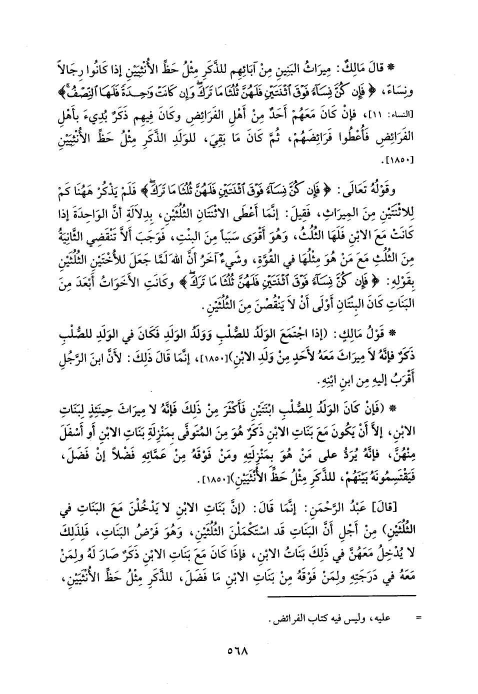 [قالَ] عَبْدُ الرَّحْمَنِ: إنَّمَا قَالَ: (إنَّ بَنَاتِ الإبْنِ لا يَدْخُلْنَ مَعَ البَنَاتِ في الثُلُثَيْنِ) مِنْ أَجْلِ أَنَّ البَنَاتِ قَد اسْتكْمَلْنَ الثُلُثَيْنِ، وَهُوَ فَرْضُ البَنَاتِ، فَلِذَلِكَ لا يُدْخِلُ مَعَهُنَّ فِي ذَلِكَ بَنَاتُ الإبْنِ، فإذَا كَانَ مَعَ بَنَاتِ الإبْنِ ذَكَر صَارَ لَهُ ولِمَنْ مَعَهُ في دَرَجَتِهِ ولِمَنْ فَوْقَهُ مِنْ بَنَاتِ الإبْنِ مَا فَضَلَ، للذَكَرِ مِثْلُ حَظِّ الأُنْثَيَيْنِ،