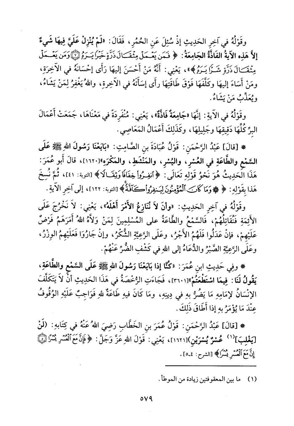 * [قالَ] عَبْدُ الرَّحْمَنِ: قَوْلُ عُبَادَةَ بنِ الصَّامِتِ: "بَايَعْنَا رَسُولَ اللهِ - صلى الله عليه وسلم - عَلَى السَّمْعِ والطَّاعَةِ في العُسْرِ، واليُسْرِ، والمَنْشَطِ، والمَكْرَهِ" [1620]، قالَ أَبو عُمَرَ: هَذَا الحَدِيثُ هُوَ نَحْوُ قَوْلهِ تَعَالَى: {انْفِرُوا خِفَافًا وَثِقَالًا} [التوبة: 41]، ثُمَّ نُسِخَ هَدْا بِقَوْلهِ: {وَمَا كَانَ الْمُؤْمِنُونَ لِيَنْفِرُوا كَافَّةً} [التوبة: 122]، إلى آخرِ الآيةِ.