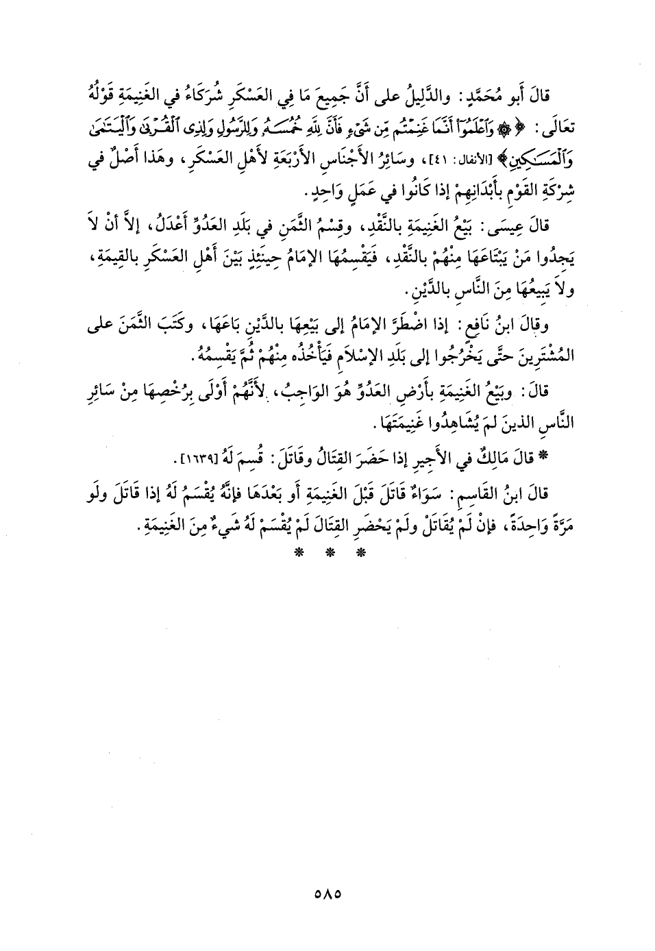قالَ: وبَيع الغَنِيمَةِ بأَرْضِ العَدُوِّ هُوَ الوَاجِبُ. لأَنَّهُمْ أَوْلَى بِرُخصِهَا مِنْ سَائِرِ النَّاسِ الذينَ لمَ يُشَاهِدُوا غَنِيمَتَهَا.
