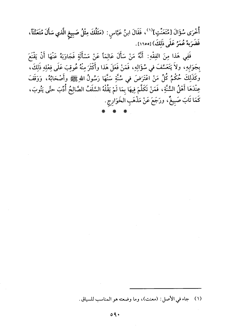 فَفِي هَذا مِنَ الفِقْهِ: أَنَّهُ مَنْ سَأَلَ عَالِمًا عَنْ مَسْأَلةٍ فَجَاوَبَهُ عَنْهَا أَنْ يَقْنَعَ بِجَوَابِهِ، ولَا يَتَعَسَّفَ في سُؤَالِهِ، فَمَنْ فَعَلَ هَذا وأَكْثَرَ مِنْهُ عُوقِبَ عَلَى فِعْلِهِ ذَلِكَ، وكَذَلِكَ حُكْمُ كُلِّ مَنْ اعْتَرَضَ في سُنَّةِ سَنَّهَا رَسُولُ اللهِ - صلى الله عليه وسلم - وأَصحَابُهُ، وَوَقَفَ عِنْدَهَا أَهْلُ السُّنَّةِ، فَمَنْ تَكَلَّمَ فِيهَا بِمَا لَمْ يَقُلْهُ السَّلَفُ الصَّالِحُ أُدِّبَ حتَّى يَتُوبَ، كَمَا تَابَ صَبِيغٌ، ورَجَعَ عَنْ مَذْهَبِ الخَوَارِجِ.