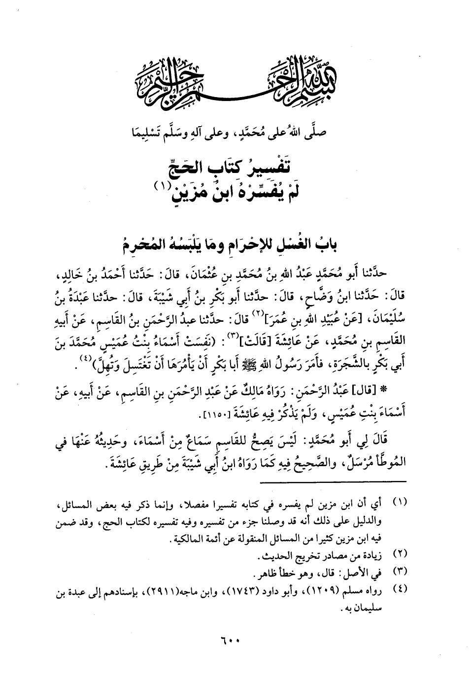 (¬1) أي أن ابن مزين لم يفسره في كتابه تفسيرًا مفصلًا، وإنما ذكر فيه بعض المسائل، والدليل على ذلك أنه فد وصلنا جزء من تفسيره وفيه تفسيره لكتاب الحج، وقد ضمن فيه ابن مزين كثيرا من المسائل المنقولة عن أئمة المالكية.