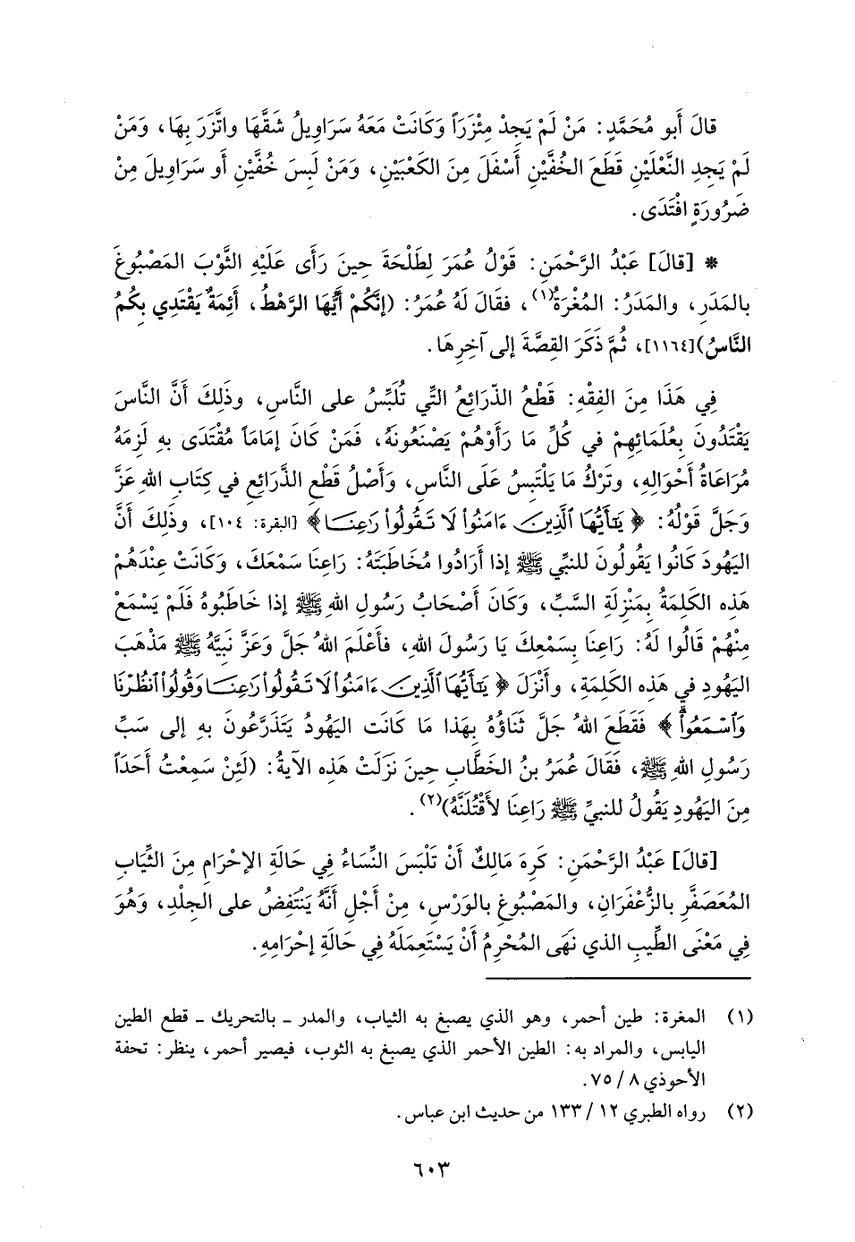 [قالَ] عَبْدُ الرَّحْمَنِ: كَرِهَ مَالِكٌ أَنْ تَلْبَسَ النِّسَاءُ فِي حَالَةِ الإحْرَامِ مِنَ الثِّيَابِ المُعَصَفَّرِ بالزُّعْفَرَانِ، والمَصْبُوغِ بالوَرْسِ، مِنْ أَجْلِ أَنَّهُ يَنتفِضُ على الجِلْدِ، وَهُوَ فِي مَعْنَى الطِّيبِ الذي نَهَى المُحْرِمُ أَنْ يَسْتَعِمَلَهُ فِي حَالَةِ إحْرَامِهِ.