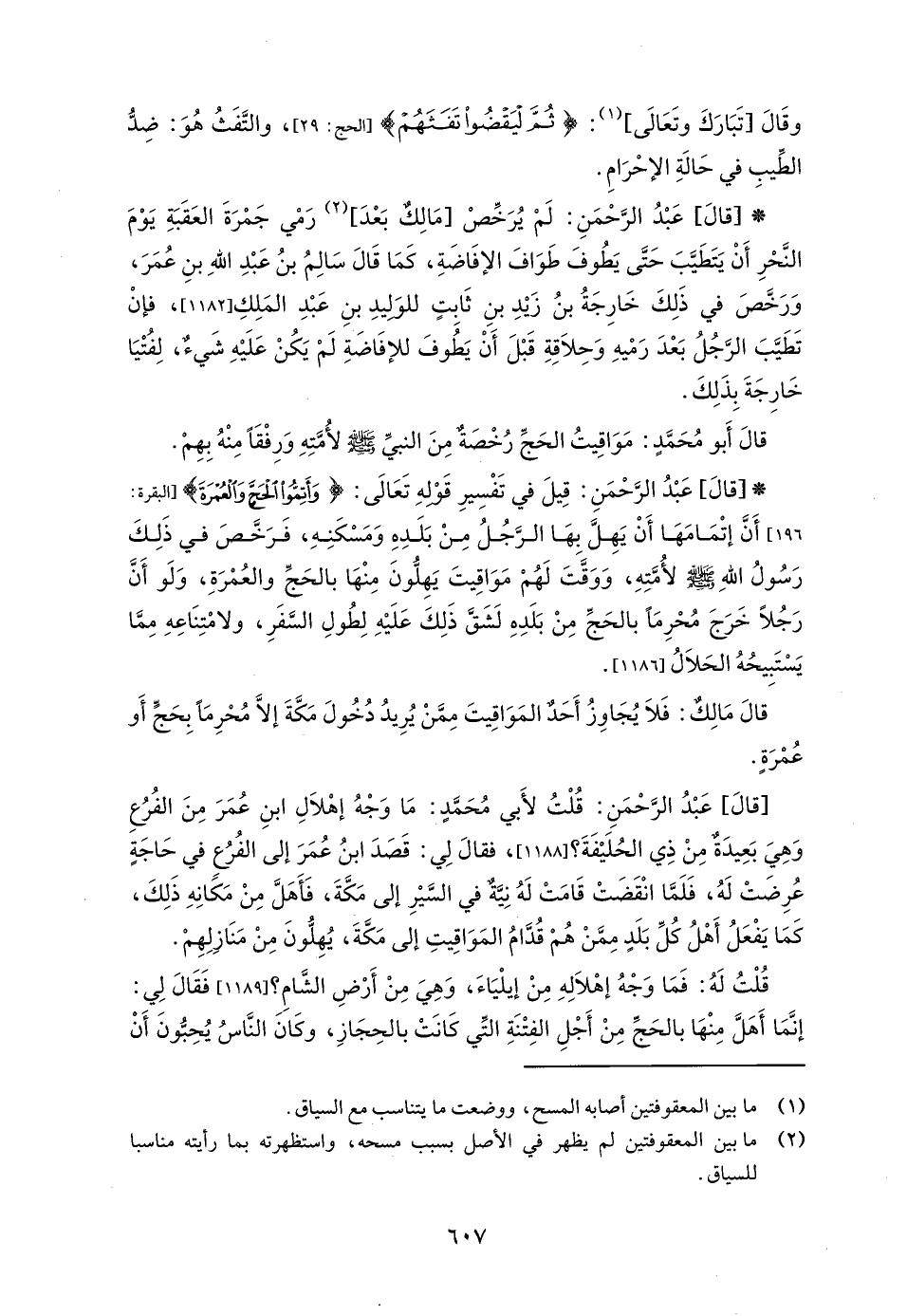 * [قالَ] عَبْدُ الرَّحْمَنِ: قِيلَ في تَفْسِيرِ قَوْلهِ تَعَالَى: {وَأَتِمُّوا الْحَجَّ وَالْعُمْرَةَ} [البقرة: 196] أَنَّ إتْمَامَهَا أَنْ يَهِلَّ بِهَا الرَّجُلُ مِنْ بَلَدِهِ وَمَسْكَنِهِ، فَرَخَّصَ في ذَلِكَ رَسُولُ الله - صلى الله عليه وسلم - لأُمَّتِهِ، وَوَقَّتَ لَهُمْ مَوَاقِيتَ يَهِلُّونَ مِنْهَا بالحَجِّ والعُمْرَةِ، وَلَو أَنَّ رَجُلًا خَرَجَ محرِمًا بالحجِّ مِنْ بَلَدِهِ لَشَقَّ ذَلِكَ عَلَيْهِ لِطُولِ السَّفَرِ، ولامْتِنَاعِهِ مِمَّا يَسْتَبِيحُهُ الحَلَالُ [1186].