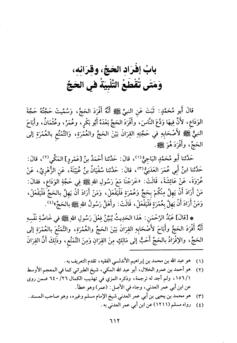 * [قالَ] عَبْدُ الرَّحْمَنِ: هَذا الحَدِيثُ يُبيِّنُ فِعْلَ رَسُولِ اللهِ - صلى الله عليه وسلم - في خَاصَّةِ نَفْسِهِ أَنَّهُ أَفْرَدَ الحَجَّ وأَبَاحَ لأَصْحَابِهِ القِرَانَ بَيْنَ الحَجِّ والعُمْرَةِ، والتَّمَتُعَ بالعُمْرَةِ إلى الحَجِّ، والإفْرَادُ بالحَجِّ أَحَبُّ إلى مَالِكٍ مِنَ القِرَانِ وَمِنَ التَّمَتُعِ، وذَلِكَ أَنَّ القِرَانَ