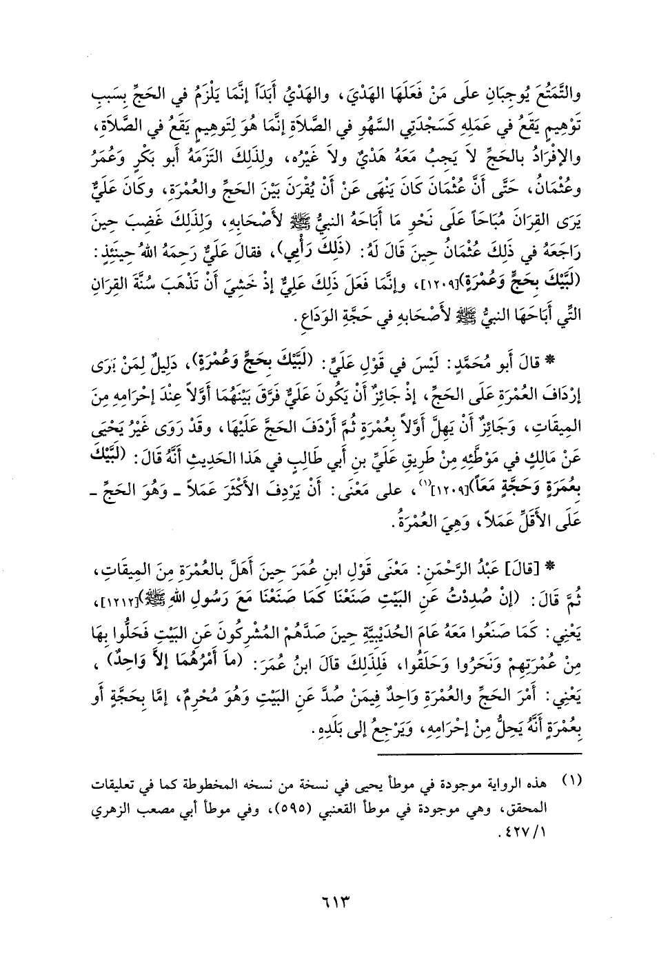 والتَّمَتُعَ يُوجِبَانِ علَى مَنْ فَعَلَهَا الهَدْيَ، والهَدْيُ أَبَدًا إنَّمَا يَلْزَمُ في الحَجِّ بِسَببِ تَوْهِيمٍ يَقَعُ في عَمَلِهِ كَسَجْدَتِي السَّهُوِ في الصَّلَاةِ إنَّمَا هُوَ لِتَوهِيمٍ يَقَعُ في الصَّلَاةِ، والإفْرَادُ بالحَجِّ لا يَجِبُ مَعَهُ هَدْيٌ ولَا غَيْرُه، ولِذَلِكَ التَزَمَهُ أَبو بَكْرٍ وَعُمَرُ وعُثْمَانُ، حَتَّى أَنَّ عُثْمَانَ كَانَ يَنْهَى عَنْ أَنْ يُقْرَنَ بَيْنَ الحَجِّ والعُمْرَةِ، وكَانَ عَلَيٌّ يَرَى القِرَانَ مُبَاحًا عَلَى نَحْوِ مَا أَبَاحَهُ النبيُّ - صلى الله عليه وسلم - لأَصْحَابِهِ، وَلِذَلِكَ غَضِبَ حِينَ رَاجَعَهُ في ذَلِكَ عُثْمَانُ حِينَ قَالَ لَهُ: (ذَلِكَ رَأْيِي)، فقالَ عَلَيٌّ -رَحِمَهُ اللهُ- حِينَئِذٍ: (لَبَّيْكَ بِحَجٍّ وَعُمْرَةٍ) [1209] , وإنَّمَا فَعَلَ ذَلِكَ عَلِيٌّ إذْ خَشِيَ أَنْ تَذْهَبَ سُنَّةَ القِرَانِ التّي أَبَاحَهَا النبيُّ - صلى الله عليه وسلم - لأصْحَابهِ في حَجَّةِ الوَدَاعِ.