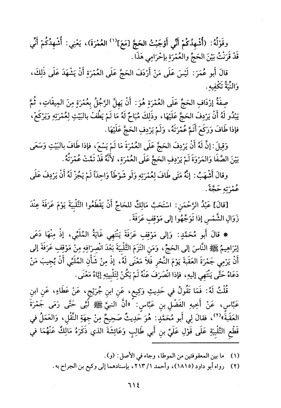قالَ أَبو عُمَرَ: لَيْسَ عَلَى مَنْ أَرْدَفَ الحَجَّ عَلَى العُمْرَةِ أَنْ يَشْهَدَ عَلَى ذَلِكَ، وَالنِّيَةُ تَكْفِيهِ.