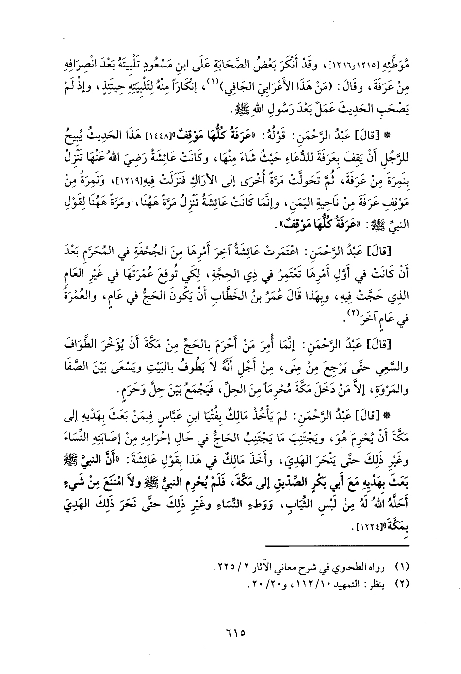 مُوَطَّئِهِ [1215 أو 1216] , وقَدْ أَنْكَرَ بَعْضُ الصَّحَابَةِ عَلَى ابنِ مَسْعُودٍ تَلْبيتَهُ بَعْدَ انْصِرَافِهِ مِنْ عَرَفَةَ، وقَالَ: (مَنْ هَذَا الأَعْرَابِيّ الجَافِي) (¬1)، إنْكَارًا مِنْهُ لِتَلْبيتِهَ حِينَئِذٍ، وإذْ لَمْ يَصْحَبِ الحَدِيثَ عَمَلٌ بَعْدَ رَسُولِ اللهِ - صلى الله عليه وسلم -.