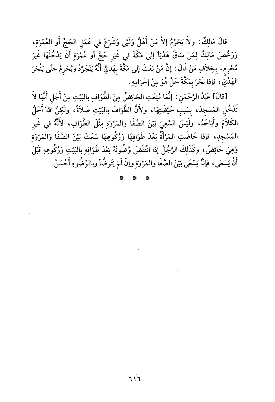 [قالَ] عَبْدُ الرَّحْمَنِ: إنَّمَا مُنِعَتِ الحَائِضُ مِنَ الطَّوَافِ بالبَيْتِ مِنْ أَجْلِ أَنَّهَا لا تَدْخُلِ المَسْجِدَ، بِسَببِ حَيضَتِهَا, ولأَنَّ الطَوَافَ بالبَيْتِ صَلَاةٌ، ولَكِنَّ الله أَحَل الكَلَامَ وأَبَاحَهُ، ولَيْسَ السَّعِيَ بَيْنَ الصَّفَا والمَرْوَةِ مِثْلَ الطَوَافِ، لأَنَّهُ في غَيْرِ المَسْجِدِ، فهذا حَاضَتِ المَرْأَةُ بَعْدَ طَوَافِهَا وَرُكُوعِهَا سَعَتْ بَينَ الصفَا وَالمَرْوَةِ وَهِيَ حَائِضٌ، وكَذَلِكَ الرَّجُلُ إذا انتقَضَ وُضُوئُهُ بَعْدَ طَوَافِهِ بالبَيْتِ وَرُكُوعِهِ قَبْلَ أَنْ يَسْعَى، فإنَّهُ يَسْعَى بَيْنَ الصَّفَا والمَرْوَةِ وإنْ لَمْ يَتَوضَّأ وبالوُضُوءِ أَحْسَنُ.