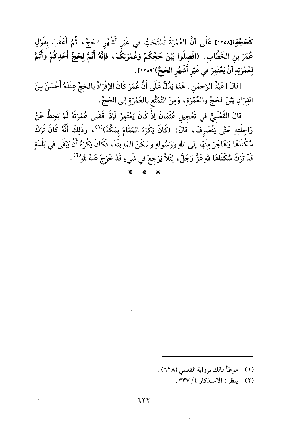 قالَ القَعْنَبِيُّ في تَعْجِيلِ عُثْمَانَ إذْ كَانَ يَعْتَمِرُ فَإذَا قَضى عُمْرَتَهُ لَمْ يَحِطَّ عَنْ رَاحِلَتِهِ حَتَّى يَنْصَرِفَ، قالَ: (كَانَ يَكْرَهُ المَقَامَ بِمَكَّةَ) (¬1)، وذَلِكَ أَنَّهُ كَانَ تَرَكَ سُكْنَاهَا وَهَاجَرَ مِنْهَا إلى اللهِ وَرَسُولهِ وسَكَنَ المَدِينَةَ، فَكَانَ يَكْرَهُ أَنْ يَبْقَى في بَلْدَةٍ قَدْ تَرَكَ سُكْنَاهَا للهِ -عَزَّ وَجَلَّ-، لِئَلَّا يَرْجِعَ في شَيءٍ قَدْ خَرَجَ عَنْهُ للهِ (¬2).