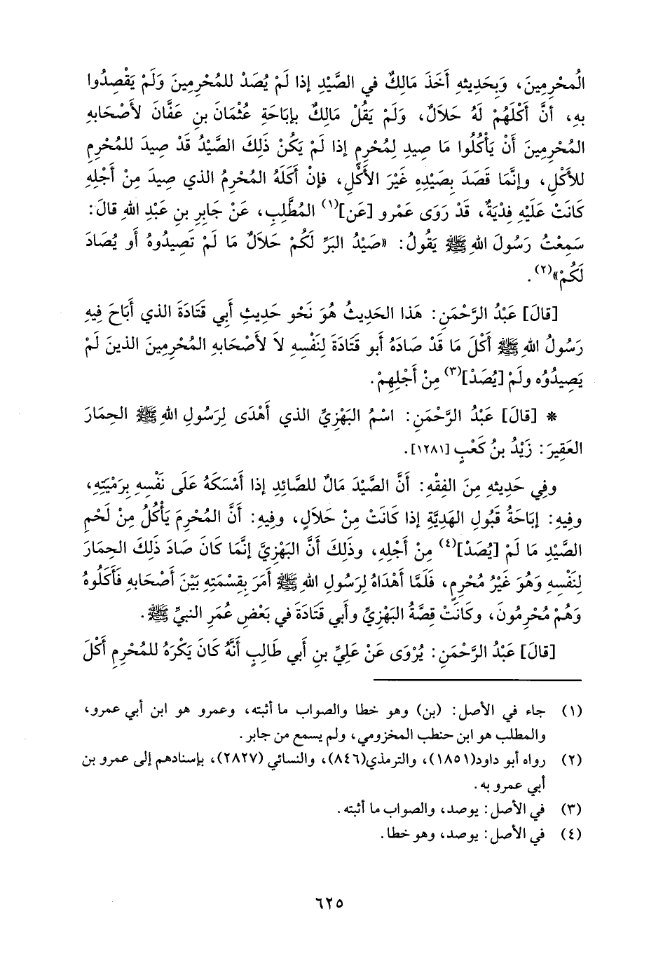 [قالَ] عَبْدُ الرَّحْمَنِ: هَذا الحَدِيثُ هُوَ نَحْو حَدِيثِ أَبِي قتَادَةَ الذي أَبَاحَ فِيهِ رَسُولُ اللهِ - صلى الله عليه وسلم - أَكْلَ مَا قَدْ صَادَهُ أَبو قَتَادَةَ لِنَفْسِهِ لا لأَصْحَابهِ المُحْرِمِينَ الذينَ لَمْ يَصِيدُوُه ولَمْ [يُصَدْ] (¬3) مِنْ أَجْلِهِمْ.