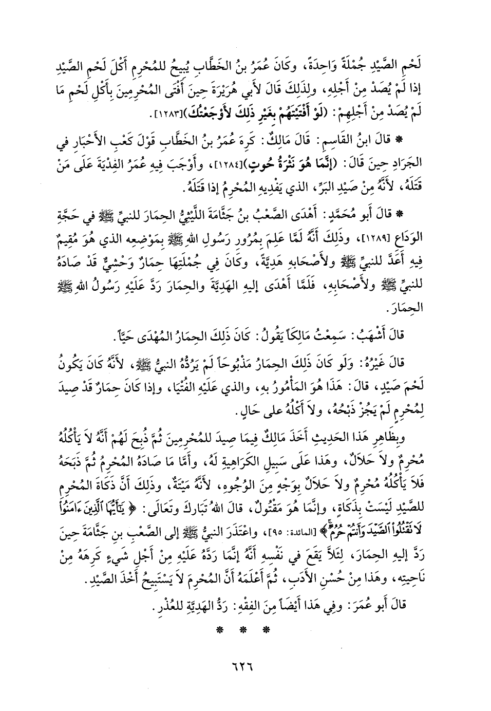 لَحْمِ الصَّيْدِ جُمْلَةً وَاحِدَةً، وكَانَ عُمَرُ بنُ الخَطَّابِ يُبيحُ للمُحْرِمِ أَكْلَ لَحْمِ الصَّيْدِ إذا لَمْ يُصَدْ مِنْ أَجْلِهِ، ولِذَلِكَ قَالَ لأَبي هُرَيْرَةَ حِينَ أَفْتَى المُحْرِمِينَ بِأَكْلِ لَحْمِ مَا لَمْ يُصَدْ مِنْ أَجْلِهِمْ: (لَوْ أَفْتَيْتَهُمْ بِغَيْرِ ذَلِكَ لأَوْجَعْتُكَ) [1283].