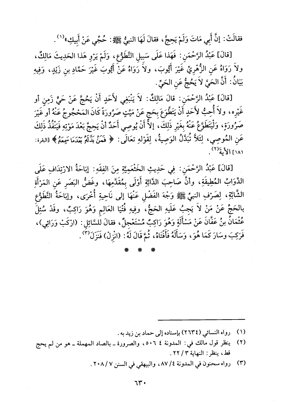 [قالَ] عَبْدُ الرَّحْمَنِ: فَهَذا عَلَى سَبيلِ التَّطَوُّعِ، وَلَمْ يَرْوِ هَذا الحَدِيثَ مَالِكٌ، ولَا رَوَاهُ عَنِ الزُّهْرِيِّ غَيْرَ أَيُّوبَ، ولَا رَوَاهُ عَنْ أَيُّوبَ غَيْرَ حَمَّادِ بنِ زَيْدٍ، وَفِيهِ بَيَانُ: أَنَّ الحَيَّ لا يَحُجُّ عَنِ الحَيِّ.
