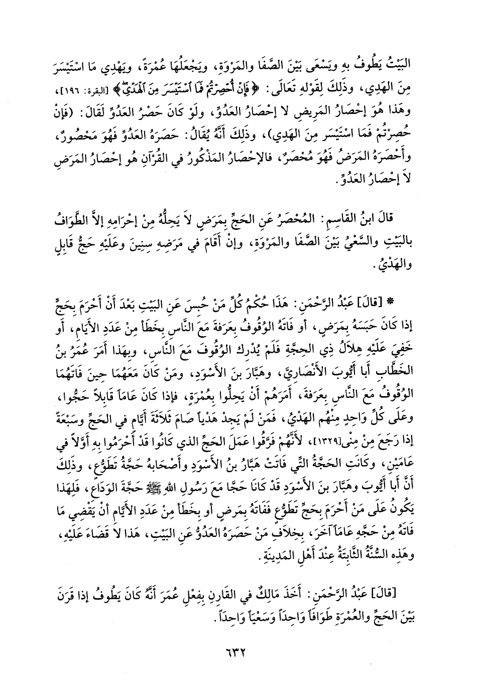 * [قالَ] عَبْدُ الرَّحْمَنِ: هَذَا حُكْمُ كُلِّ مَنْ حُبسَ عَنِ البَيْتِ بَعْدَ أَنْ أَحْرَمَ بِحَج إذا كَانَ حَبَسَهُ بِمَرَضٍ، أو فَاتَهُ الوُقُوفُ بِعَرَفةَ مَعً النَّاسِ بخَطَأ مِنْ عَدَدِ الأَيَامِ، أَو خَفِيَ عَلَيْهِ هِلَالُ ذِي الحِجَّةِ فَلَمْ يُدْرِك الوُقُوفَ مَعَ النَّاسِ، وبِهَذا أَمَرَ عُمَرُ بنُ الخَطَّابِ أبا أَيُّوبَ الأَنْصَارِيَّ، وهَبَّارَ بنَ الأَسْوَدِ، ومَنْ كَانَ مَعَهُمَا حِينَ فَاتَهُمَا الوُقُوفُ مَعَ النَّاسِ بِعَرَفةَ، أَمَرَهُمْ أَنْ يَحِلُّوا بِعُمْرَةٍ، فهذا كَانَ عَامًا قَابِلَا حَجُّوا، وعَلَى كُلِّ وَاحِدٍ مِنْهُم الهَدْيُ، فَمَنْ لَمْ يَجِدْ هَدْيًا صَامَ ثَلَاثَةَ أَيَّام في الحَجِّ وسَبْعَةً إذا رَجَعَ مِنْ مِنْى [1329] , لأَنَهُمْ فَرَّقُوا عَمَلَ الحَجِّ الذي كَانُوا قَدْ أحْرَمُوا بِهِ أَوَّلَا في عَامَيْنِ، وكَانَتِ الحَجَّةُ التِّي فَاتَتْ هَبَّارُ بنُ الأَسْوَدِ وأَصْحَابهُ حَجَّةُ تَطَوُّعٍ، وذَلِكَ أَنَ أبا أَيُّوبَ وهَبَّارَ بنَ الأَسْوَدِ قَدْ كَانَا حَجَّا مَعَ رَسُولِ اللهِ - صلى الله عليه وسلم - حَجَّةَ الوَدَاعِ، فَلِهَذا يَكُونُ عَلَى مَنْ أَحْرَمَ بِحَجِّ تَطَوُّعٍ فَفَاتَهُ بِمَرضٍ أو بِخَطَأ مِنْ عَدَدِ الأَيَّامِ أنْ يَقْضِي مَا فَاتَهُ مِنْ حَجهِ عَامًا آخَرَ، بِخِلَافِ مَنْ حَصَرَهُ العَدُوُّ عَنِ البَيْتِ، هَذا لا قَضَاءَ عَلَيْهِ، وهَذِه الشُنَّةُ الثَّابِتَةُ عِنْدَ أَهْلِ المَدِينَةِ.