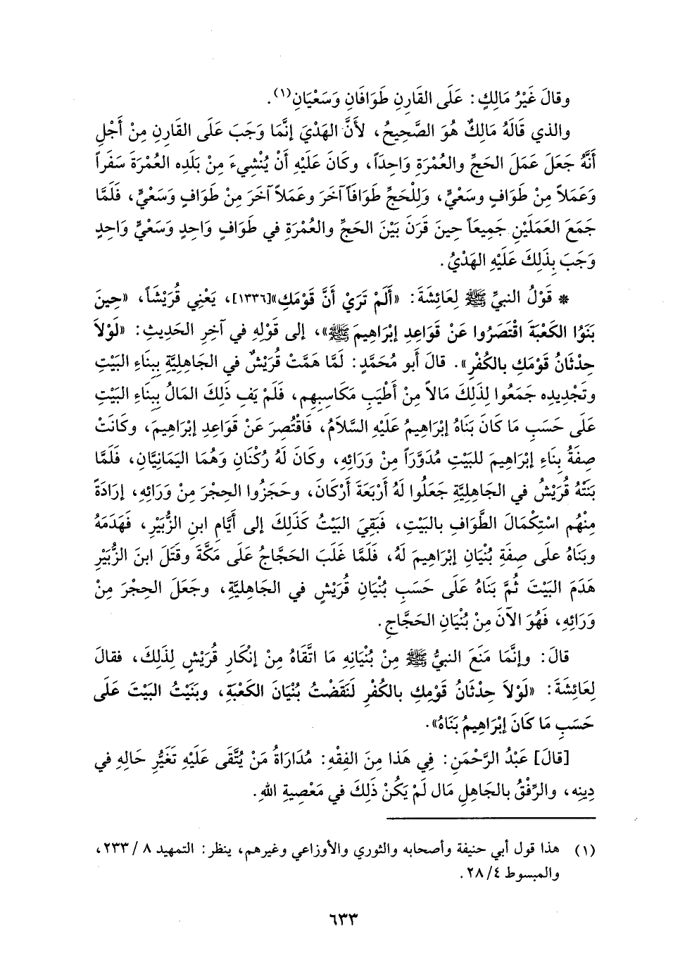 * قَوْلُ النبيِّ - صلى الله عليه وسلم - لِعَائِشَةَ: "أَلَمْ تَرَيْ أَنَّ قَوْمَكِ" [1336] , يَعْنِي قُرَيْشًا، "حِينَ بَنَوُا الكَعْبَةَ اقْتَصَرُوا عَنْ قَوَاعِدِ إبْرَاهِيمَ - صلى الله عليه وسلم - "، إلى قَوْلهِ في آخِرِ الحَدِيثِ: "لَوْلَا حِدْثَانُ قَوْمَكِ بالكُفْرِ". قالَ أَبو مُحَمَّدٍ: لَمَّا هَمَّتْ قُرَيْشٌ في الجَاهِلِيّهِ بِبنَاءِ البَيْتِ وتَجْدِيدِه جَمَعُوا لِذَلِكَ مَالًا مِنْ أَطْيَبِ مَكَاسِبِهِم، فَلَمْ يَفِ ذَلِكَ المَالُ بينَاءِ البَيْتِ عَلَى حَسَبِ مَا كَانَ بَنَاهُ إبْرَاهِيمُ - عَلَيْهِ السَّلَامُ -، فَاقْتُصِرَ عَنْ قَوَاعِدِ إبْرَاهِيمَ، وكَانَتْ صِفَةُ بِنَاءِ إبْرَاهِيمَ للبَيْتِ مُدَوَّرًا مِنْ وَرَائِهِ، وكَانَ لَهُ رُكْنَانِ وَهُمَا اليَمَانِيَّانِ، فَلَمَّا بَنتَهُ قُرَيْشٌ في الجَاهِلِيَّةِ جَعَلُوا لَهُ أَرْبَعَةَ أَرْكَانَ، وحَجَزُوا الحِجْرَ مِنْ وَرَائِهِ، إرَادَةً مِنْهُم اسْتِكْمَالَ الطَّوَافِ بالبَيْتِ، فَبَقِيَ البَيْتُ كَذَلِكَ إلى أيَّامِ ابنِ الزُّبَيْرِ، فَهَدَمَهُ وبَنَاهُ علَى صِفَةِ بُنْيَانِ إبْرَاهِيمَ لَهُ، فَلَمَّا غَلَبَ الحَجَّاجُ عَلَى مَكَّةَ وقَتَلَ ابنَ الزُّبَيْرِ هَدَمَ البَيْتَ ثُمَّ بَنَاهُ عَلَى حَسَبِ بُنْيَانِ قُرَيْشٍ في الجَاهِليَّهِ، وجَعَلَ الحِجْرَ مِنْ وَرَائِهِ، فَهُوَ الآنَ مِنْ بُنْيَانِ الحَجَّاجِ.