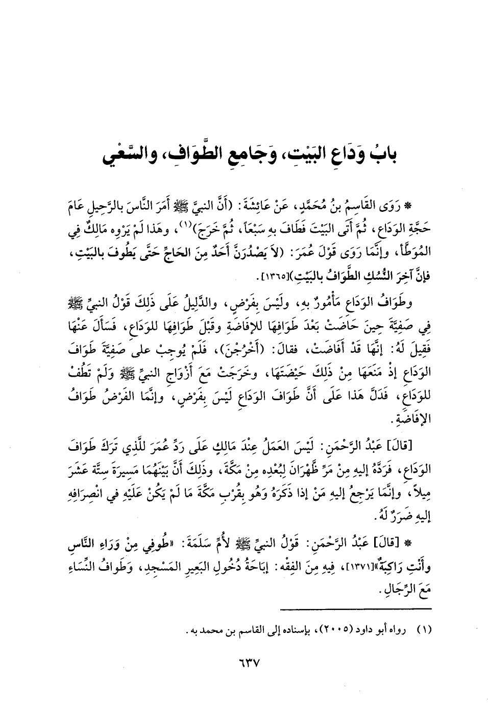 * رَوَى القَاسِمُ بنُ مُحَمَّدٍ، عَنْ عَائِشَةَ: (أَنَّ النبيَّ - صلى الله عليه وسلم - أَمَرَ النَّاسَ بالرَّحِيلِ عَامَ حَجَّةِ الوَدَاع، ثُمَّ أتى البَيْتَ فَطَافَ بهِ سَبْعًا، ثُمَّ خَرَجَ) (¬1)، وهَذا لَمْ يَرْوِ 5 مَالِكٌ في المُوَطَّأ، وإنَّمَا رَوَى قَوْلَ عُمَرَ: (لا يَصْدُرَنَّ أَحَدٌ مِنَ الحَاجِّ حَتَّى يَطُوفَ بالبَيْتِ، فإنَّ آخِرَ النُّسُكِ الطَّوَافُ بالبَيْتِ) [1365].