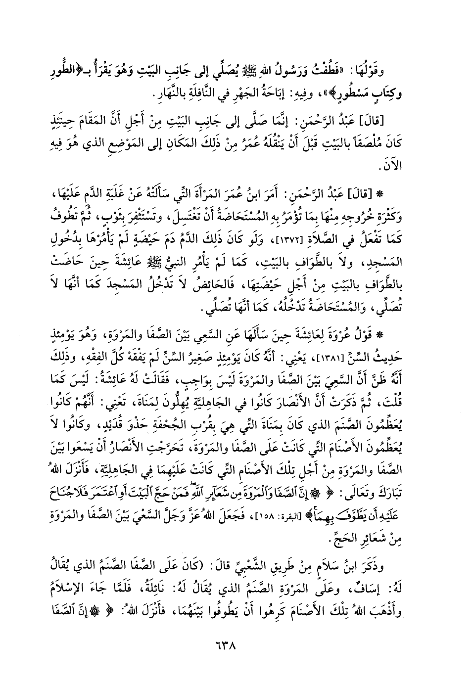 * [قالَ] عَبْدُ الرَّحْمَنِ: أَمَرَ ابنُ عُمَرَ المَرْأَةَ التِّي سَأَلتْهُ عَنْ غَلَبَةِ الدَّمِ عَلَيْهَا، وَكَثْرَةِ خُرُوجِهِ مِنْهَا بِمَا تُؤْمَرُ بِهِ المُسْتَحَاضَةُ أَنْ تَغْتَسِلَ، وتَسْتَثْفِرَ بِثَوْبٍ، ثُمَّ تَطُوفُ كَمَا تَفْعَلُ في الصَّلَاةِ [1372] وَلَو كَانَ ذَلِكَ الدَّمُ دَمَ حَيْضَةٍ لَمْ يَأْمُرْهَا بِدُخُولِ المَسْجِدِ، ولَا بالطَّوَافِ بالبَيْتِ، كَمَا لَمْ يَأْمُرِ النبي - صلى الله عليه وسلم - عَائِشَةَ حِينَ حَاضَتْ بالطَوَافِ بالبَيْتِ مِنْ أَجْلِ حَيْضَتِهَا، فَالحَائِضُ لا تَدْخُلُ المَسْجِدَ كَمَا أنَّهَا لا تُصَلِّي، وَالمُسْتَحَاضَةُ تَدْخُلُهُ، كَمَا أنَّهَا تُصَلِّي.