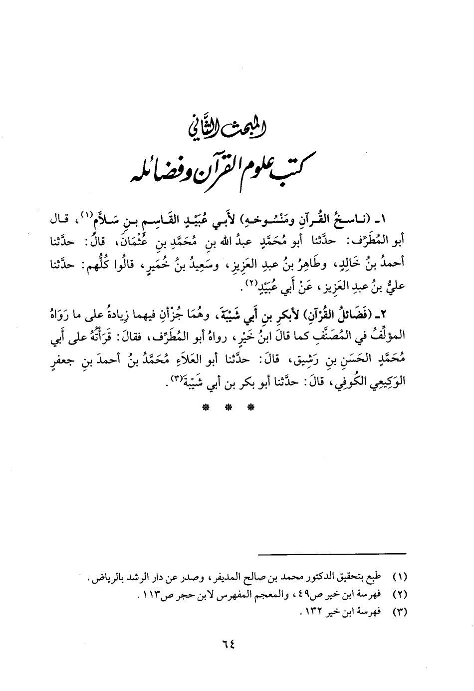 2 - (فَضَائلُ القُرْآنِ) لأبكرِ بنِ أَبي شَيبَةَ، وهُمَا جُزْأنِ فيهما زِيادةُ على ما رَوَاهُ المؤلِّفُ في المُصَنَّفِ كما قالَ ابنُ خَيْرٍ، رواهُ أبو المُطَرِّف، فقالَ: قَرَأْتُهُ على أَبي مُحَمَّدٍ الحَسَنِ بنِ رَشِيق، قالَ: حدَّثنا أبو العَلاَءِ مُحَمَّدُ بنُ أحمدَ بنِ جعفرٍ الوَكِيعِي الكُوفِي، قالَ: حدَّثنا أبو بكر بن أبي شَيْبةَ (¬3).