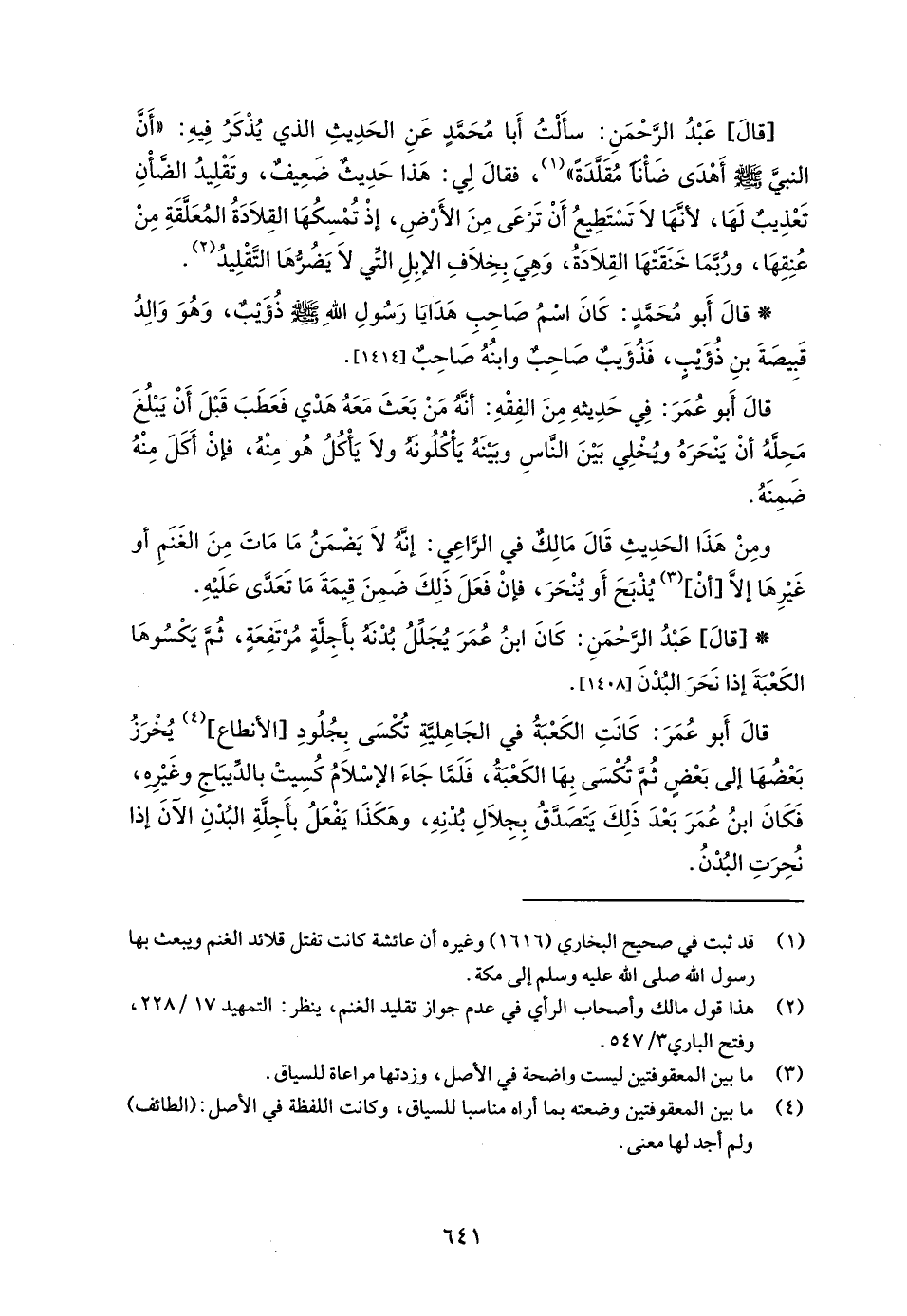 [قالَ] عَبْدُ الرَّحْمَنِ: سأَلْتُ أبا مُحَمَّدٍ عَنِ الحَدِيثِ الذي يُذْكَرُ فِيهِ: "أَنَّ النبيَّ - صلى الله عليه وسلم - أَهْدَى ضَأْنًا مُقَلَّدَةً" (¬1)، فقالَ لِي: هَذا حَدِيثٌ ضَعِيفٌ، وتَقْلِيدُ الضَّاْنِ تَعْذِيبٌ لَهَا؛ لأنَّهَا لا تَسْتَطِيعُ أَنْ تَرْعَى مِنَ الأَرْضِ، إذْ تُمْسِكُهَا القِلَادَةُ المُعَلَّقَةِ مِنْ عُنِقِهَا، ورُبَّمَا خَنَقَتْهَا القِلَادَةُ، وَهِيَ بِخِلَافِ الإبِلِ التِّي لا يَضُرُّهَا التَّقْلِيدُ (¬2).