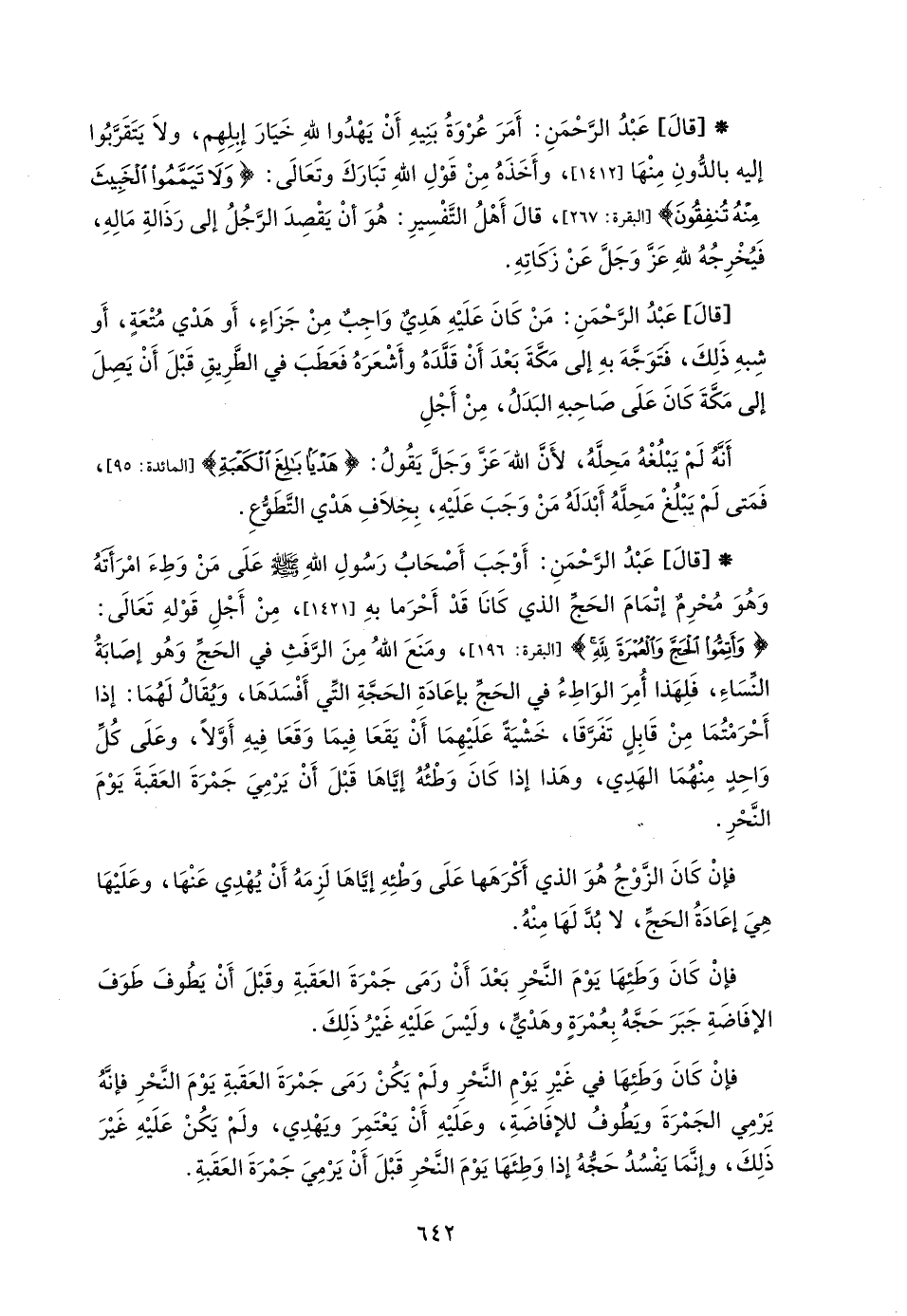 * [قالَ] عَبْدُ الرَّحْمَنِ: أَوْجَبَ أَصْحَابُ رَسُولِ اللهِ - صلى الله عليه وسلم - عَلَى مَنْ وَطِءَ امْرَأتهُ وَهُوَ مُحْرِمٌ إتْمَامَ الحَجِّ الذي كَانَا قَدْ أَحْرَما بهِ [1421] , مِنْ أَجْلِ قَوْلهِ تَعَالَى: {وَأَتِمُّوا الْحَجَّ وَالْعُمْرَةَ لِلَّهِ} [البقرة: 196] , ومَنَعَ اللهُ مِنَ الرَّفَثِ في الحَجِّ وَهُو إصَابَةُ النّسَاءِ، فَلِهَذا أُمِرَ الوَاطِءُ في الحَجّ بإعَادَةِ الحَجَّةِ التِّي أَفْسَدَهَا، وَيُقَالُ لَهُمَا: إذا أَحْرَمْتُمَا مِنْ قَابِلٍ تَفَرَّقَا، خَشْيَة عَلَيْهِمَا أَنْ يَقَعَا فِيمَا وَقَعَا فِيهِ أَوَّلَا، وعَلَى كُلِّ وَاحِدٍ مِنْهُمَا الهَدِي، وهَذا إذا كَانَ وَطْئُهُ إيَّاهَا قَبْلَ أَنْ يَرْمِيَ جَمْرَةَ العَقَبةَ يَوْمَ النَّحْرِ.