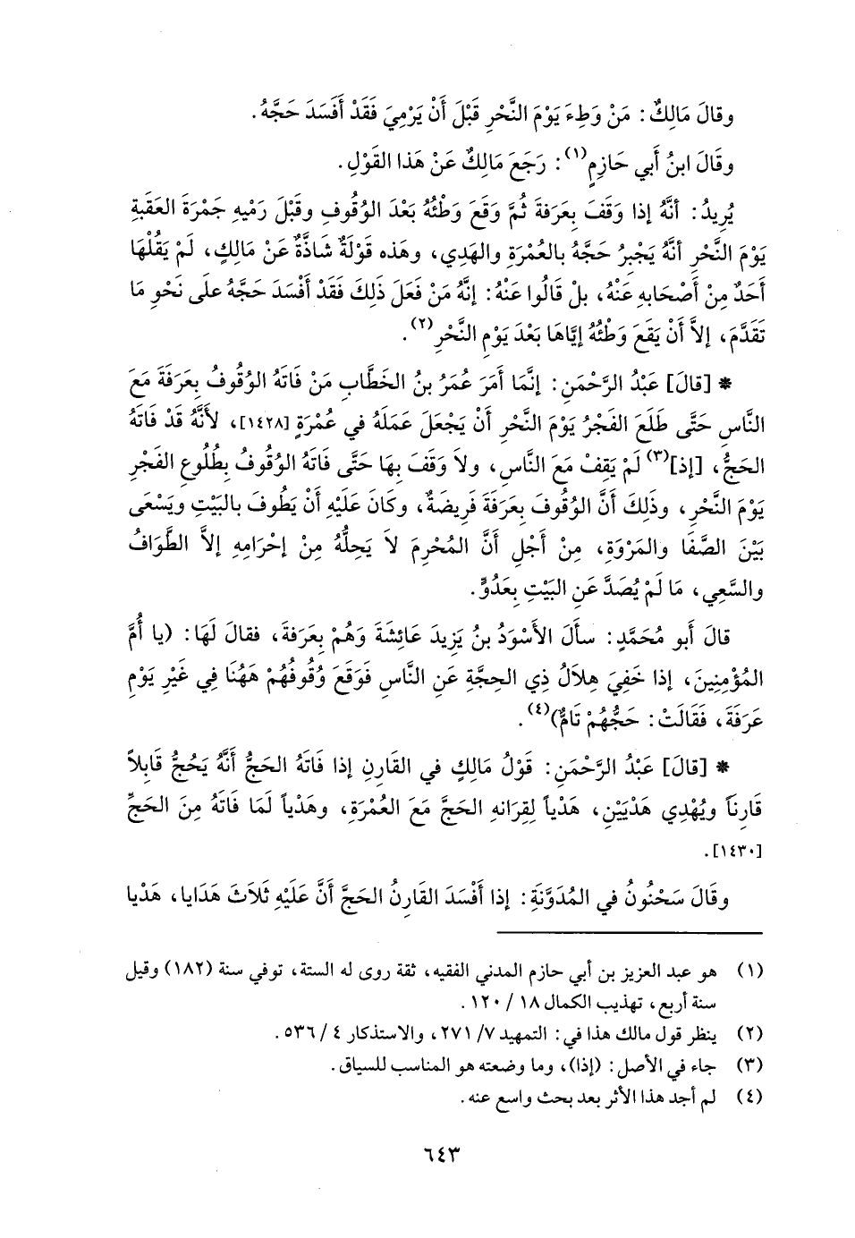 * [قالَ] عَبْدُ الرَّحْمَنِ: قَوْلُ مَالِكٍ في القَارِنِ إذا فَاتَهُ الحَجُّ أَنَّهُ يَحُجُّ قَابِلًا قَارِنًا ويُهْدِي هَدْيَيْنِ، هَدْيًا لِقِرَانهِ الحَجَّ مَعَ العُمْرَةِ، وهَدْيًا لَمَا فَاتَهُ مِنَ الحَجِّ [1430].