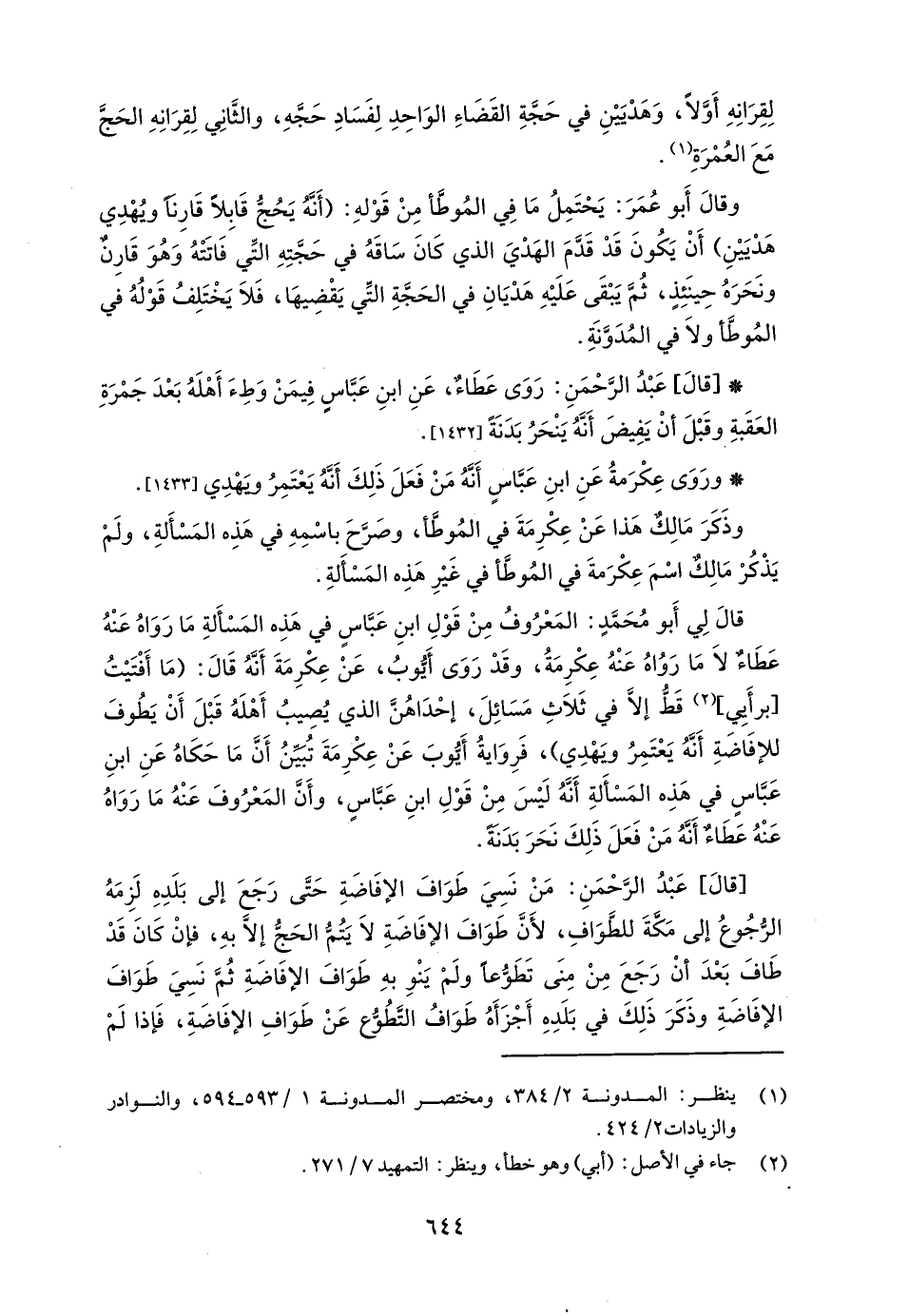 وقالَ أَبو عُمَرَ: يَحْتَمِلُ مَا في المُوطَّأ مِنْ قَوْلهِ: (أَنَّهُ يَحُجُّ قَابِلًا قَارِنًا ويُهْدِي هَدْيَيْنِ) أَنْ يَكُونَ قَدْ قَدَّمَ الهَدْيَ الذي كَانَ سَاقَهُ في حَجَّتِهِ التِّي فَاتَتْهُ وَهُوَ قَارِن ونَحَرَهُ حِينَئِذٍ، ثُمَّ يَبْقَى عَلَيْهِ هَدْيَانِ في الحَجَّةِ التِّي يَقْضِيهَا، فَلَا يَخْتَلِفُ قَوْلُهُ في المُوطَّأ ولَا في المُدَوَّنَةِ.