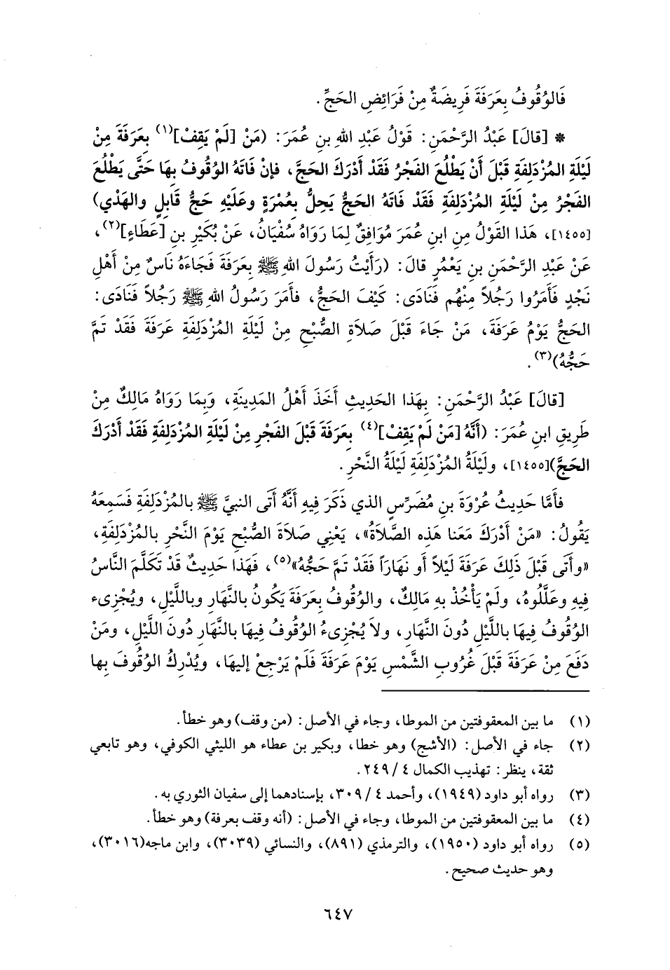 * [قالَ] عَبْدُ الرَّحْمَنِ: قَوْلُ عَبْدِ اللهِ بنِ عُمَرَ: (مَنْ [لَمْ يَقِفْ] (¬1) بِعَرَفَةَ مِنْ لَيْلَةِ المُزْدَلِفَةِ قَبْلَ أَنْ يَطْلُعَ الفَجْرُ فَقَدْ أَدْرَكَ الحَجَّ، فإنْ فَاتَهُ الوُقُوفُ بهَا حَتَّى يَطْلُعَ الفَجْرُ مِنْ لَيْلَةِ المُزْدَلِفَةِ فَقَدْ فَاتَهُ الحَجُّ يَحِلُّ بعُمْرَةٍ وعَلَيْهِ حَجُّ قَابلٍ والهَدْي) [1455] , هَذا القَوْلُ مِنِ ابنِ عُمَرَ مُوَافِقٌ لِمَا رَوَاهُ سُفْيَانُ، عَنْ بُكَيْرِ بنِ [عَطَاءٍ] (¬2)، عَنْ عَبْدِ الرَّحْمَنِ بنِ يَعْمُرٍ قالَ: (رَأَيْتُ رَسُولَ اللهِ - صلى الله عليه وسلم - بِعَرَفَةَ فَجَاءَهُ نَاس مِنْ أَهْلِ نَجْدٍ فَأَمَروا رَجُلَا مِنْهُم فَنَادَى: كَيفَ الحَجُّ، فأَمَرَ رَسُولُ اللهِ - صلى الله عليه وسلم - رَجُلًا فَنَادَى: الحَجُّ يَوْمُ عَرَفَةَ، مَنْ جَاءَ قَبْلَ صَلَاةِ الصُّبْحِ مِنْ لَيْلَةِ المُزْدَلِفَةِ عَرَفَةَ فَقَدْ تَمَّ
