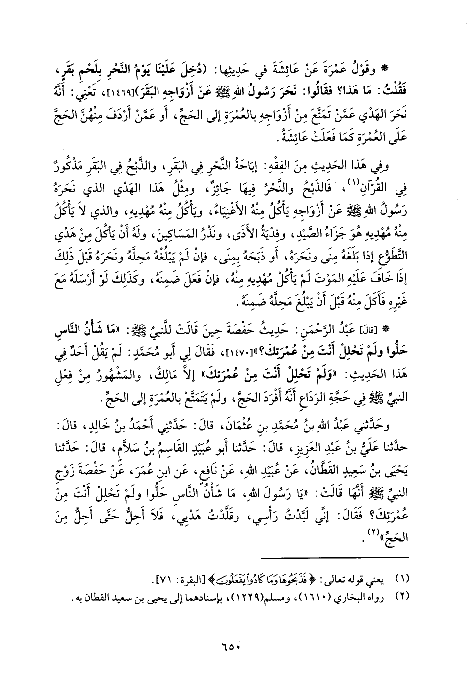 * وقَوْلُ عَمْرَةَ عَنْ عَائِشَةَ في حَدِيثِها: (دُخِلَ عَلَيْنَا يَوْمُ النَّحْرِ بلَحْمِ بَقَرٍ، فَقُلْتُ: مَا هَذا؟ فقَالُوا: نَحَرَ رَسُولُ اللهِ - صلى الله عليه وسلم - عَنْ أَزْوَاجِهِ البَقَرَ) [1469] , تَعْنِي: أَنَّهُ نَحَرَ الهَدْي عَمَّنْ تَمَتَّعَ مِنْ أَزْوَاجِهِ بالعُمْرَةِ إلى الحَجِّ، أَو عَمَّنْ أَرْدَفَ مِنْهُنَّ الحَجَّ عَلَى العُمْرَةِ كَمَا فَعَلَتْ عَائِشَةُ.