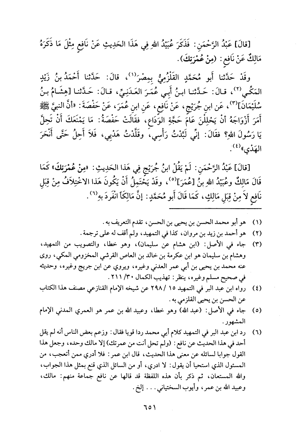 (¬6) رد ابن عبد البر في التمهيد كلام أبي محمد ردا قويا فقال: وزعم بعض الناس أنه لم يقل أحد في هذا الحديث عن نافع: (ولم تحل أنت من عمرتك) إلَّا مالك وحده، وجعل هذا القول جوابا لسائله عن معنى هذا الحديث، قال ابن عمر: فلا أدري ممن أتعجب، من المسئول الذي استحيا أن يقول: لا ادري، أو من السائل الذي قنع بمثل هذا الجواب، والله المستعان، ثم ذكر بأن هذه اللفظة قد قالها عن نافع جماعة منهم: مالك، وعبيد الله بن عمر، وأيوب السختياني ... إلخ.