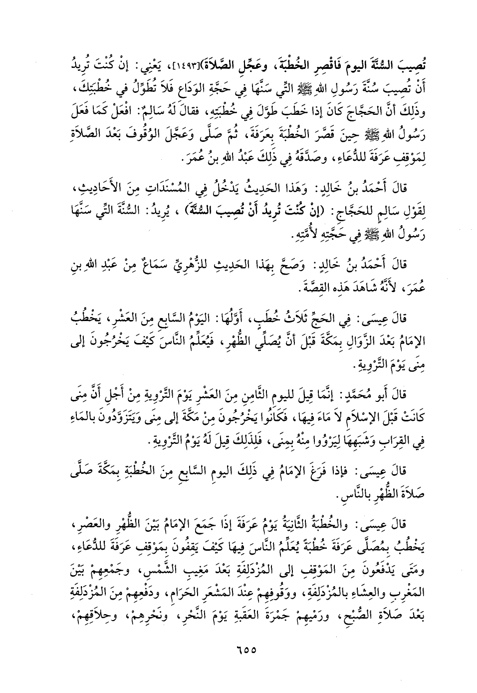 قالَ أَحْمَدُ بنُ خَالِدٍ: وَهَذا الحَدِيثُ يَدْخُلُ فِي المُسْنَدَاتِ مِنَ الأَحَادِيثِ، لِقَوْلِ سَالِمٍ للحَجَّاجِ: (إنْ كنتَ تُرِيدُ أَنْ تُصِيبَ السُّنَّةَ)، يُرِيدُ: السُّنَّةَ التِّي سَنَّهَا رَسُولُ اللهِ - صلى الله عليه وسلم - فِي حَجَّتِهِ لأُمَّتِهِ.