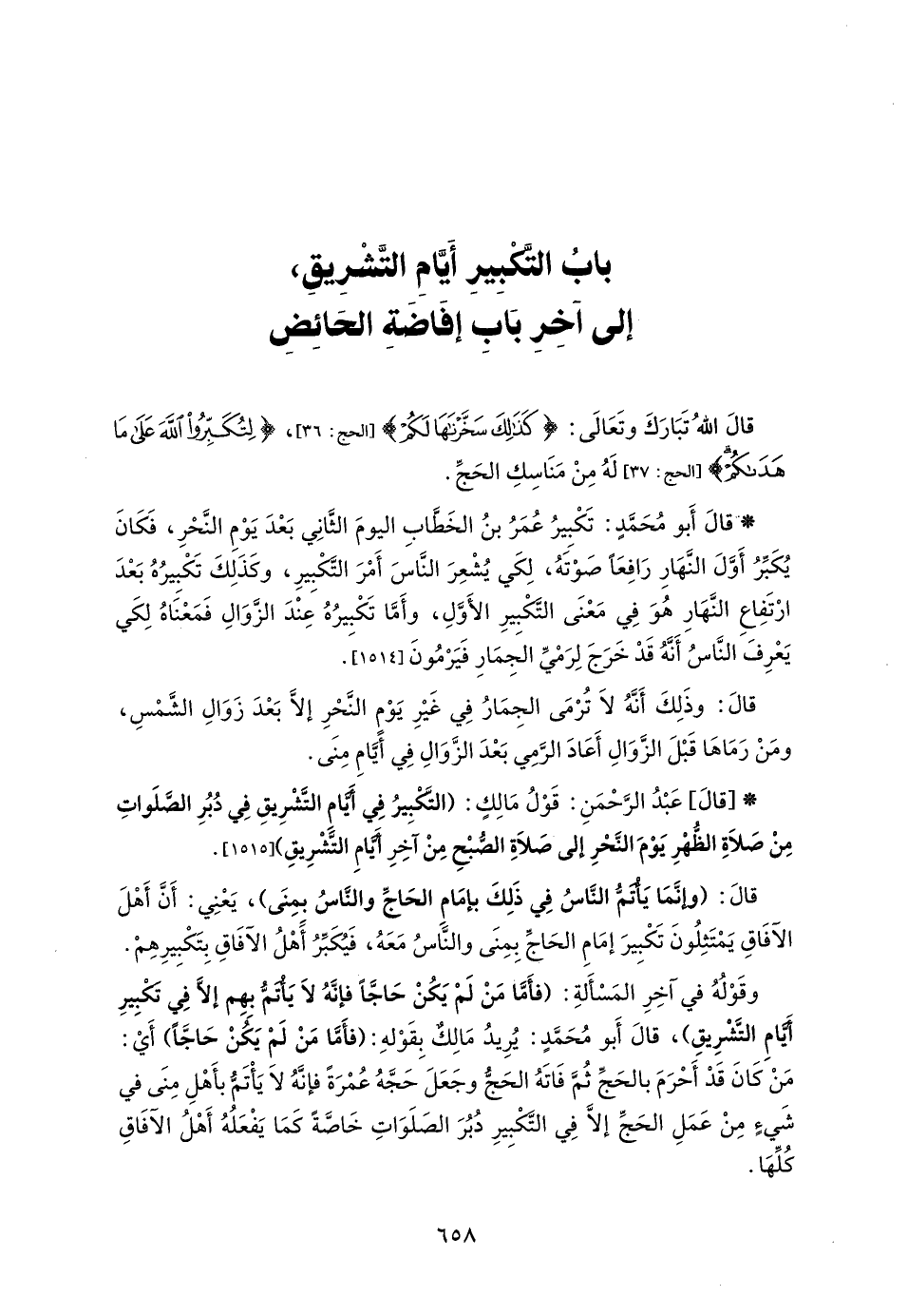 * [قالَ] عَبْدُ الرَّحْمَنِ: قَوْلُ مَالِكٍ: (التَكبيرُ فِي أَيَّامِ التَشْرِيقِ فِي دُبُرِ الصَّلَواتِ مِنْ صَلَاةِ الظُّهْرِ يَوْمَ النَّحْرِ إلى صَلَاةِ الصُّبْحِ مِنْ آخِرِ أَيَّامِ التَّشْرِيقِ) [1515].