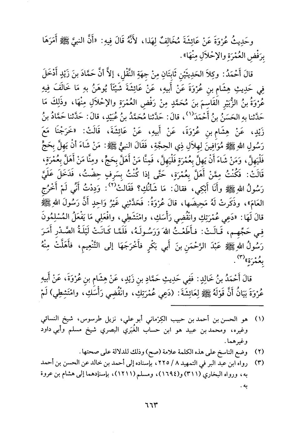 قالَ أَحْمَدُ: وكِلاَ الحَدِيثَيْنِ ثَابِتَانِ مِنْ جِهَةِ النَّقْلِ، إلَّا أنَّ حَمَّادَ بنَ زَيْدٍ أَدْخَلَ فِي حَدِيثِ هِشَامِ بنِ عُرْوَةَ عَنْ أَبيهِ، عَنْ عَائِشَةَ شَيْئَاً يُوهَنُ بهِ مَا خَالَفَ فِيهِ عُرْوَةُ بنُ الزُّبَيْرِ القَاسِمَ بنَ مُحَمَّدٍ مِنْ رَفْضِ العُمْرَةِ والإحْلاَلِ مِنْهَا، وذَلِكَ مَا حَدَّثنا بهِ الحَسَنُ بنُ أَحْمَدَ (¬1)، قالَ: حَدَّثنا مُحَمَّدُ بنُ عُبَيْدٍ، قالَ: حَدَّثنا حَمَّادُ بنُ زَيْدٍ، عَنْ هِشَامِ بنِ عُرْوَةَ، عَنْ أَبيهِ، عَنْ عَائِشَةَ، قَالَتْ: "خَرَجْنَا مَعَ رَسُولِ اللهِ - صلى الله عليه وسلم - موَافِينَ لِهِلاَلِ ذِي الحِجَّةِ، فَقَالَ النبيُّ - صلى الله عليه وسلم -: مَنْ شَاءَ أنْ يَهِلَّ بِحَجٍّ فَلْيَهِلَّ، وَمَنْ شَاءَ أَنْ يَهِلَّ بِعُمْرَةٍ فَلْيَهِلَّ، فَمِنَّا مَنْ أَهَلَّ بِحَج، ومِنَّا مَنْ أَهَلَّ بِعُمْرَةٍ، قَالَتْ: فَكُنْتُ مِمَّنْ أَهَلَّ بِعُمْرَةٍ، حَتَّى إذا كُنْتُ بِسَرِفٍ حِضْتُ، فَدَخَلَ عَلَيَّ رَسُولُ اللهِ - صلى الله عليه وسلم - وأَنَا أَبْكِي، فقالَ: مَا شَانُكِ؟ فَقَالتْ (¬2): وَدِدْتُ أَنِّي لَمْ أَخْرُجِ العَامَ"، وذَكَرتْ لَهُ مَحِيضَها، قالَ عُرْوَةُ: فَحَدَّثنِي غَيْرُ وَاحِدٍ أَنَّ رَسُولَ اللهِ - صلى الله عليه وسلم - قالَ لَهَا: "دَعِي عُمْرَتكِ وانْقُضِي رَأْسَكِ، وامْتَشَطِي، وافْعَلِي مَا يَفْعَلُ المُسْلِمُونَ فِي حَجِّهِم، قَالَتْ: فأَطَعْتُ اللهَ وَرَسُولَهُ، فَلَمَّا كَانَتْ لَيْلَةُ الصَّدْرِ أَمَرَ رَسُولُ اللهِ - صلى الله عليه وسلم - عبْدَ الرَّحْمَنِ بنَ أَبي بَكْرٍ فأَخْرَجَهَا إلى التَّنْعِيمِ، فأَهَلَّتْ مِنْهُ بِعُمْرَةٍ" (¬3).