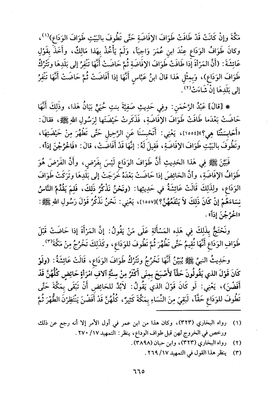 وحَدِيثُ النبيِّ - صلى الله عليه وسلم - يُبيِّنُ أَنَّهَا تَخْرُجُ وتترُكُ طَوَافَ الوَدَاعِ، قَالَتْ عَائِشَةُ: (ولَوْ كَانَ قَوْلَ الذي يَقُولُونَ حَقَّا لأَصْبَحَ بِمِنَى أَكثَرُ مِنْ سِتَّةِ آلافِ امْرَأةٍ حَائِضٍ كُلُّهُنَّ قَدْ أَفَضْنَ)، يَعْنِي: لَو كَانَ قَوْلَ الذي يَقُولُ: لاَبُدَّ للحَائِضِ أَنْ تَبْقَى بِمَكَّةَ حَتَّى تَطُوفَ للوَدَاعِ حَقَّاً، لَبَقِيَ مِنَ النِّسَاءِ بِمَكَةَ كَثيرٌ، كُلُهُن قَدْ أَفَضْنَ يَنتظِرْنَ الطُّهْرَ ثُمَّ