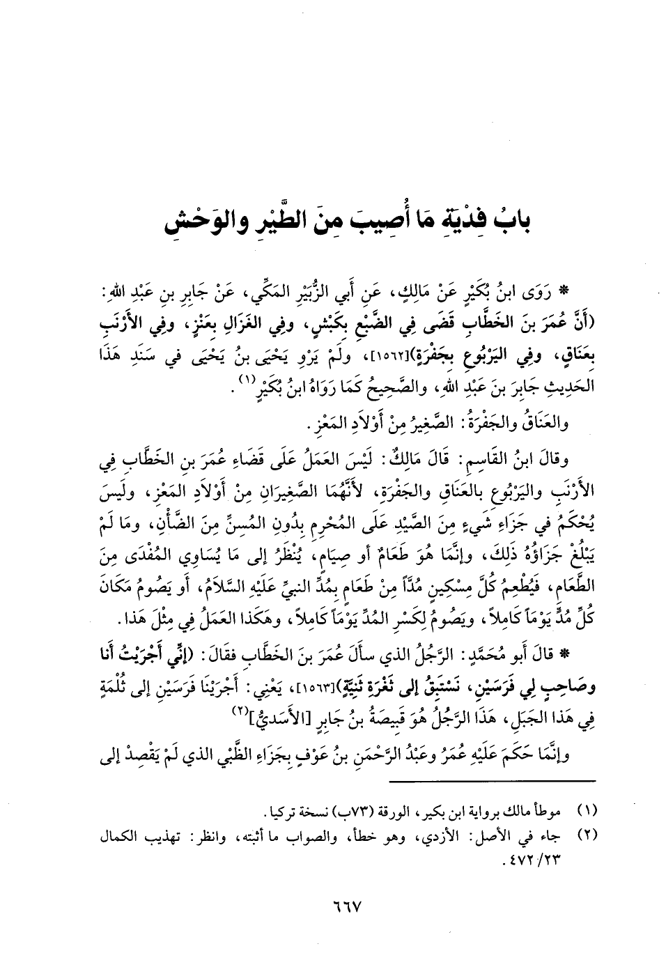 * رَوَى ابنُ بُكَيْرٍ عَنْ مَالِكٍ، عَنِ أَبي الزُّبَيْرِ المَكّي، عَنْ جَابِرِ بنِ عَبْدِ اللهِ: (أَنَّ عُمَرَ بنَ الخَطَّابِ قَضَى فِي الضَّبْعِ بِكَبْشٍ، وفِي الغَزَالِ بِعَنْزٍ، وفِي الأَرْنَبِ بعَنَاقٍ، وفِي اليَرْبُوعِ بجَفْرَةٍ) [15621]، ولَمْ يَرْوِ يحيى بنُ يَحْيىَ في سَنَدِ هَذَا اَلحَدِيثِ جَابِرَ بنَ عَبْدِ اللهِ، والصَّحِيحُ كَمَا رَوَاهُ ابنُ بُكَيْرٍ (¬1).
