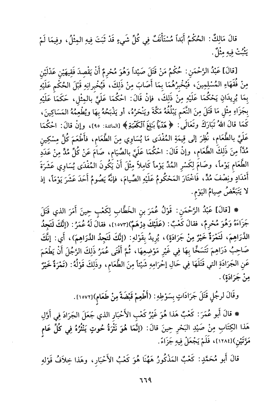[قالَ] عَبْدُ الرَّحْمَنِ: حُكْمُ مَنْ قَتَلَ صَيْداً وَهُوَ مُحْرِمٌ أَنْ يَقْصِدَ فَقِيهَيْنِ عَدْلَيْنِ مِنْ فُقَهَاءِ المُسْلِمِينَ، فَيُخْبِرُهُمَا بِمَا أَصَابَ مِنْ ذَلِكَ، فَيُخْبِرانِهِ قَبْلَ الحُكْمِ عَلَيْهِ بِمَا يُرِيدَانِ يَحْكُمَا عَلَيْهِ مِنْ ذَلِكَ، فإنْ قَالَ: احْكُمَا عَلَيَّ بالمِثْلِ، حَكَمَا عَلَيْهِ بِجَزَاءِ مِثْلِ مَا قَتَلَ مِنَ النَّعَمِ يَبْلُغُهُ مَكَّةَ ويَنْحَرُهُ، أو يَذْبَحُهُ بِهَا ويُطْعِمُهُ المَسَاكِينَ، كَمَا قالَ اللهُ تَبَارَكَ وتَعَالَى: {هَدْيًا بَالِغَ الْكَعْبَةِ} [المائدة: 95]، وإنْ قالَ: احْكُمَا عَلَيَّ بالطَّعَامِ، نُظِرَ إلى قِيمَةِ المُفْدَى مَا يُسَاوِي مِنَ الطَّعَامِ، فأَطْعَمَ كُلَّ مِسْكِينٍ مُدَّاً مِنَ ذَلِكَ الطَعَامِ، وإنْ قَالَ: احْكُمَا عَلَيَّ بالصِّيَامِ، صَامَ عَنْ كُلِّ مُدٍ مِنْ عَدَدِ الطَّعَامِ يَوْماً، وصَامَ لِكَسْرِ المُدِّ يَوْماً كَامِلاً مِثْلَ أَنْ يَكُونَ المُفْدَى يُسَاوِي عَشَرَةَ أَمْدَادٍ ونِصْفَ مُدٍّ، فَاخْتَارَ المَحْكُومُ عَلَيْهِ الصِّيامَ، فإنَّهُ يَصُومُ أَحَدَ عَشَرَ يَوْمَاً، إذ لا يَتَبَعَّضُ صِيامُ اليَوْمِ.