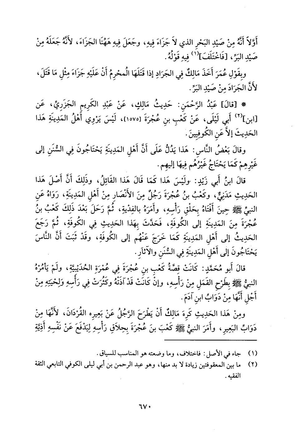 قالَ ابنُ أَبي زَيْدٍ: ولَيْسَ هَذا كَمَا قَالَ هَذا القَائِلُ، وذَلِكَ أَنَّ أَصْلَ هَذا الحَدِيثِ مَدَنِيّ، وكَعْبُ بنُ عُجْرَةَ رَجُلٌ مِنَ الأَنْصَارِ مِنْ أَهْلِ المَدِينَةِ، رَوَاهُ عَنِ النبيِّ - صلى الله عليه وسلم - حِينَ أَفْتَاهُ بِحَلْقِ رَأْسِهِ، وأَمَرَهُ بالفِدْيةِ، ثُمَّ رَحَلَ بَعْدَ ذَلِكَ كَعْبُ بنُ عُجْرَةَ مِنَ المَدِينَةِ إلى الكُوفَةِ، فَحَدَّثَ بِهَذا الحَدِيثِ فِي الكُوفَةِ، ثُمَّ رَجَعَ الحَدِيثُ إلى أَهْلِ المَدِينَةِ كَمَا خَرَجَ عَنْهُم إلى الكُوفَةِ، وقَدْ ثَبَتَ أَنَّ النَّاسَ يَحْتَاجُونَ إلى أَهْلِ المَدِينَةِ فِي السُّنَنِ والآثاَرِ.