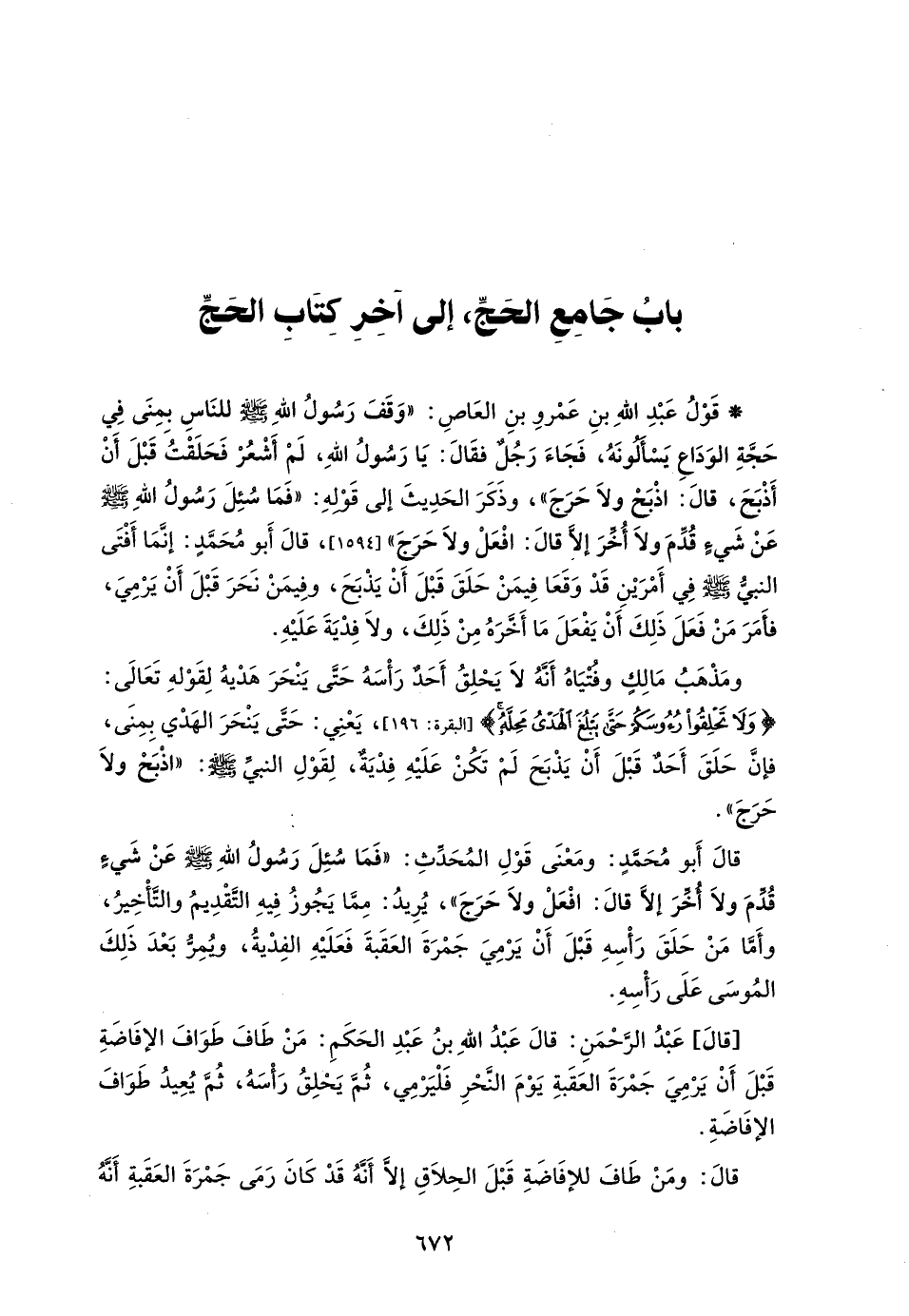 قالَ أَبو مُحَمَّدٍ: ومَعْنَى قَوْلِ المُحَدِّثِ: "فَمَا سُئِلَ رَسُولُ اللهِ - صلى الله عليه وسلم - عَنْ شَيءٍ قُدّمَ ولَا اخّرَ إلَّا قالَ: افْعَلْ ولَا حَرَجَ"، يُرِيدُ: مِمَّا يَجُوزُ فِيهِ التَقْدِيمُ والتأخِيرُ، وأَمَّا مَنْ حَلَقَ رَأْسِهِ قَبْلَ أَنْ يَرْمِيَ جَمْرَةَ العَقَبةَ فَعَلَيْهِ الفِدْيةُ، وُيمِرُّ بَعْدَ ذَلِكَ المُوسَى عَلَى رَأْسِهِ.