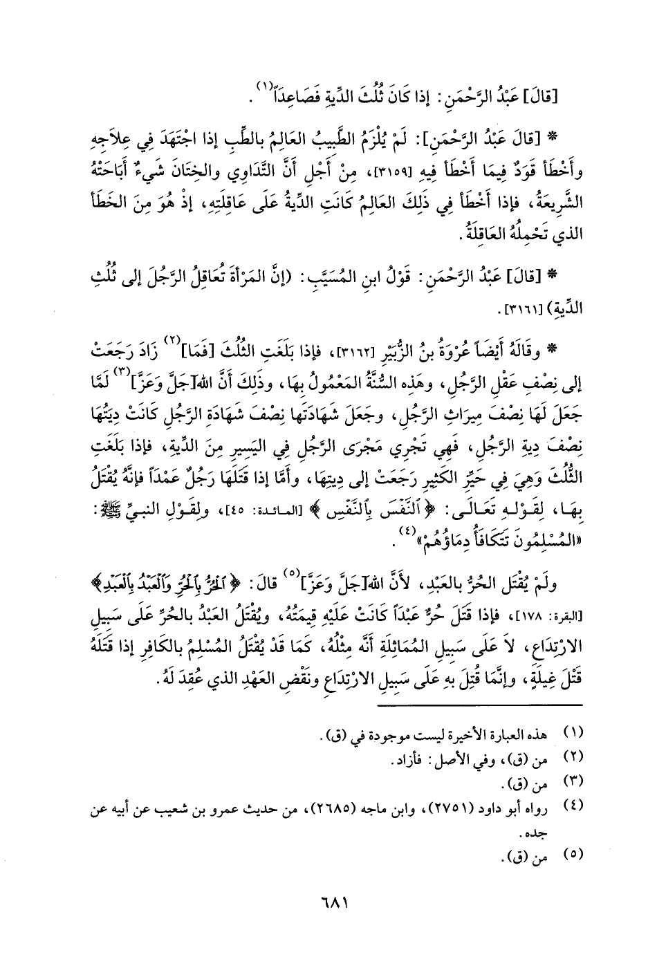 * [قالَ] عَبْدُ الرَّحْمَنِ: قَوْلُ ابنِ المُسَتبِ: (إنَّ المَرْأةَ تُعَاقِلُ الرَّجُلَ إلى ثُلُثِ الدِّيةِ) [3161].