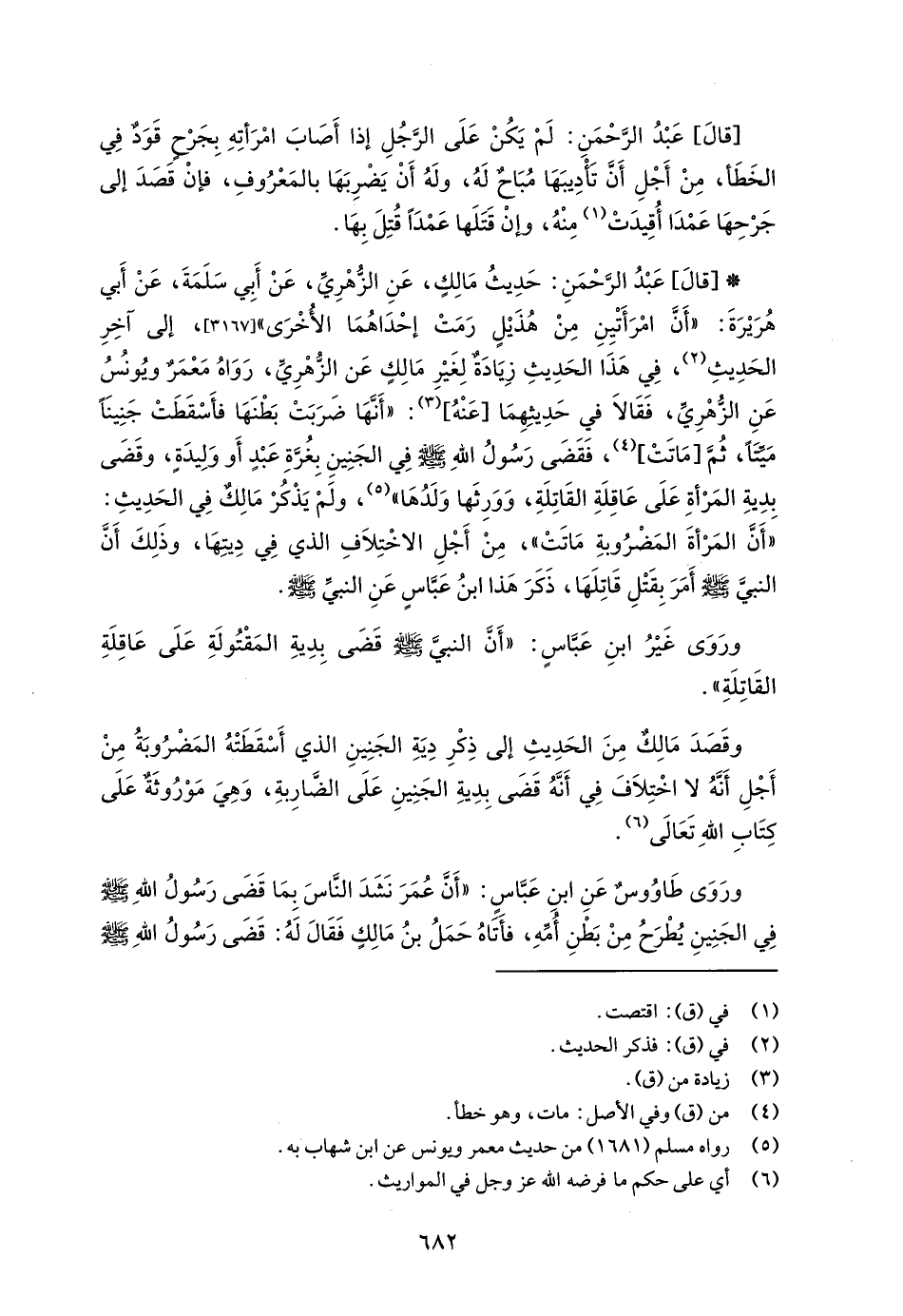 * [قالَ] عَبْدُ الرَّحْمَنِ: حَدِيثُ مَالِكٍ، عَنِ الزُّهْرِيِّ، عَنْ أَبِي سَلَمَةَ، عَنْ أَبي هُرَيْرَةَ: "أَنَّ امْرَأَتْيِنِ مِنْ هُذَيْلٍ رَمَتْ إحْدَاهُمَا الأُخْرَى" [3167]، إلى آخِرِ الحَدِيثِ (¬2)، فِي هَذَا الحَدِيثِ زِيَادَ لِغَيْرِ مَالِكٍ عَن الزُّهْرِيِّ، رَوَاهُ مَعْمَر ويُونسٌ عَنِ الزُّهْرِيِّ، فَقَالاَ في حَدِيثِهِمَا [عَنْهُ] (¬3): "أَنَّهَا ضَرَبَتْ بَطْنَهَا فأَسْقَطَتْ جَنِينَاً مَتِّتَاً، ثُمَّ [مَاتَتْ] (¬4)، فَقَضَى رَسُولُ اللهِ - صلى الله عليه وسلم - فِي الجَنِينِ بِغُزَةِ عَبْدٍ أَو وَلِيدَةٍ، وقَضَى بِدِيةِ المَرْأةِ عَلَى عَاقِلَةِ القَاتِلَةِ، وَوَرِثَها وَلَدُهَا" (¬5)، ولَمْ يَذْكُرْ مَالِكٌ فِي الحَدِيثِ: "أَنَّ المَرْأةَ المَضْرُوبةِ مَاتَتْ"، مِنْ أَجْلِ الاخْتِلاَفِ الذي فِي دِيتِهَا، وذَلِكَ أَنَّ النبيَّ - صلى الله عليه وسلم - أَمَرَ بِقَتْلِ قَاتِلَهَا، ذَكَرَ هَذا ابنُ عَبَّاسٍ عَنِ النبيِّ - صلى الله عليه وسلم -.