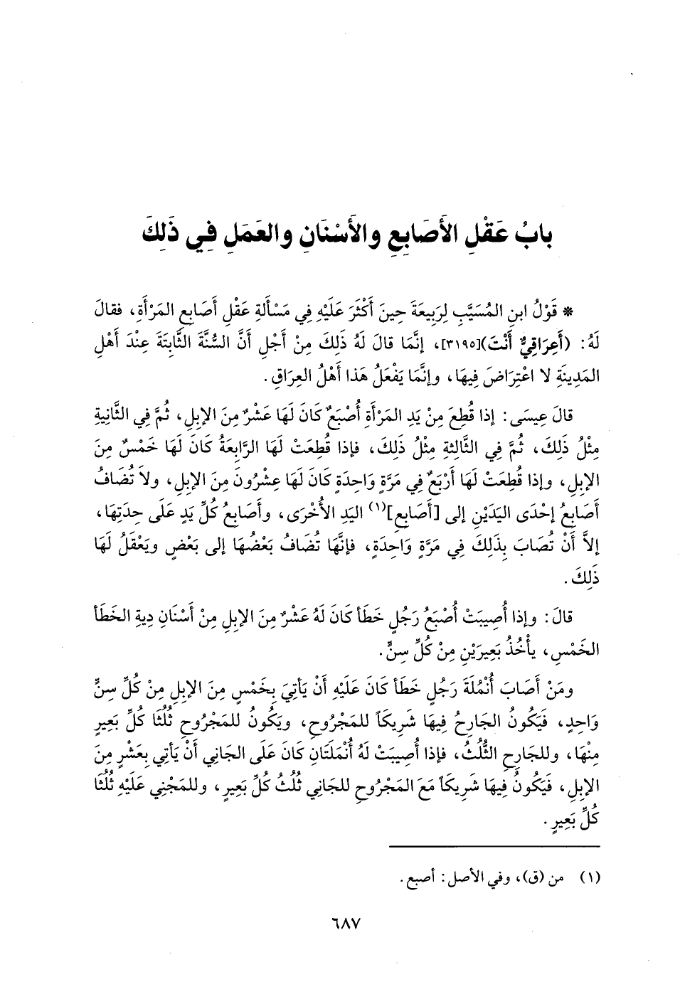 ومَنْ أَصَابَ أُنْمُلَةَ رَجُلٍ خَطَأ كَانَ عَلَيْهِ أَنْ يَأتِيَ بِخَمْسٍ مِنَ الإبِلِ مِنْ كُلِّ سِنٍّ وَاحِدٍ، فَيَكُونُ الجَارِحُ فِيهَا شَرِيكَاً للمَجْرُوحِ، ويَكُونُ للمَجْرُوحِ ثُلُثَا كُلِّ بَعِيرٍ مِنْهَا، وللجَارِحِ الثُّلُثُ، فإذا أُصِيبَتْ لَهُ أُنْمَلَتَانِ كَانَ عَلَى الجَانِي أَنْ يَأتِي بِعَشرٍ مِنَ الإبِلِ، فَيَكُونُ فِيهَا شَرِيكَا مَعَ المَجْرُوحِ للجَانِىِ ثُلُثُ كُلِّ بَعِيرٍ، وللمَجْنِي عَلَيْهِ ثُلُثَا كُلِّ بَعِيرٍ.