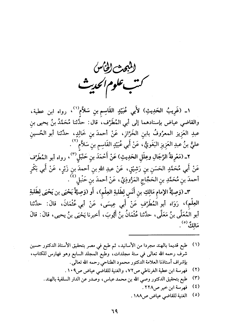 1 - (غَرِيبُ الحَدِيثِ) لأَبي عُبَيْدٍ القَاسِمِ بنِ سَلَّامٍ (¬1)، رواه ابن عطية، والقاضي عياض بإسنادهما إلى أبي المُطَرِّف، قال: حدَّثنا مُحَمَّدُ بنُ يحيى بنِ عبدِ العَزِيز المعرُوفُ بابنِ الخَرَّازِ، عَنْ أحمدَ بنِ خَالِدٍ، حدَّثنا أبو الحُسينِ عليُّ بنُ عبدِ العَزِيزِ البَغَويُّ، عَنْ أَبي عُبَيْدٍ القَاسِمِ بنِ سَلَّامٍ (¬2).