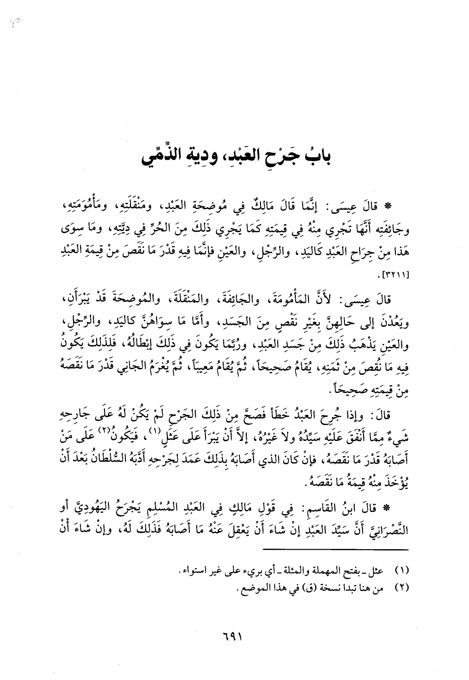 * قالَ ابنُ القَاسِمِ: فِي قَوْلِ مَالِكٍ فِي العَبْدِ المُسْلِمِ يَجْرَحُ اليَهُودِيَّ أو النَّصْرَانِيَّ أَنَّ سَيِّدَ العَبْدِ إنْ شَاءَ أَنْ يَعْقِلَ عَنْهُ مَا أَصَابَهُ فَذَلِكَ لَهُ، وإنْ شَاءَ أَنْ
